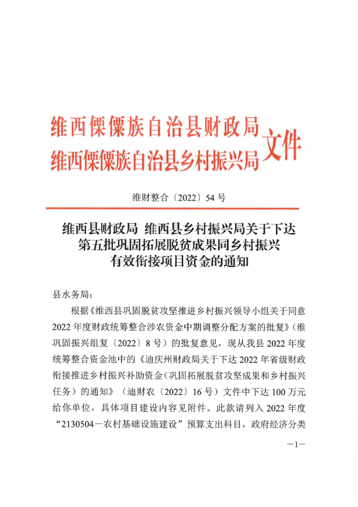 维西县财政局 维西县乡村振兴局关于下达第五批巩固拓展脱贫攻坚成果同乡村振兴有效衔接项目资金的通知