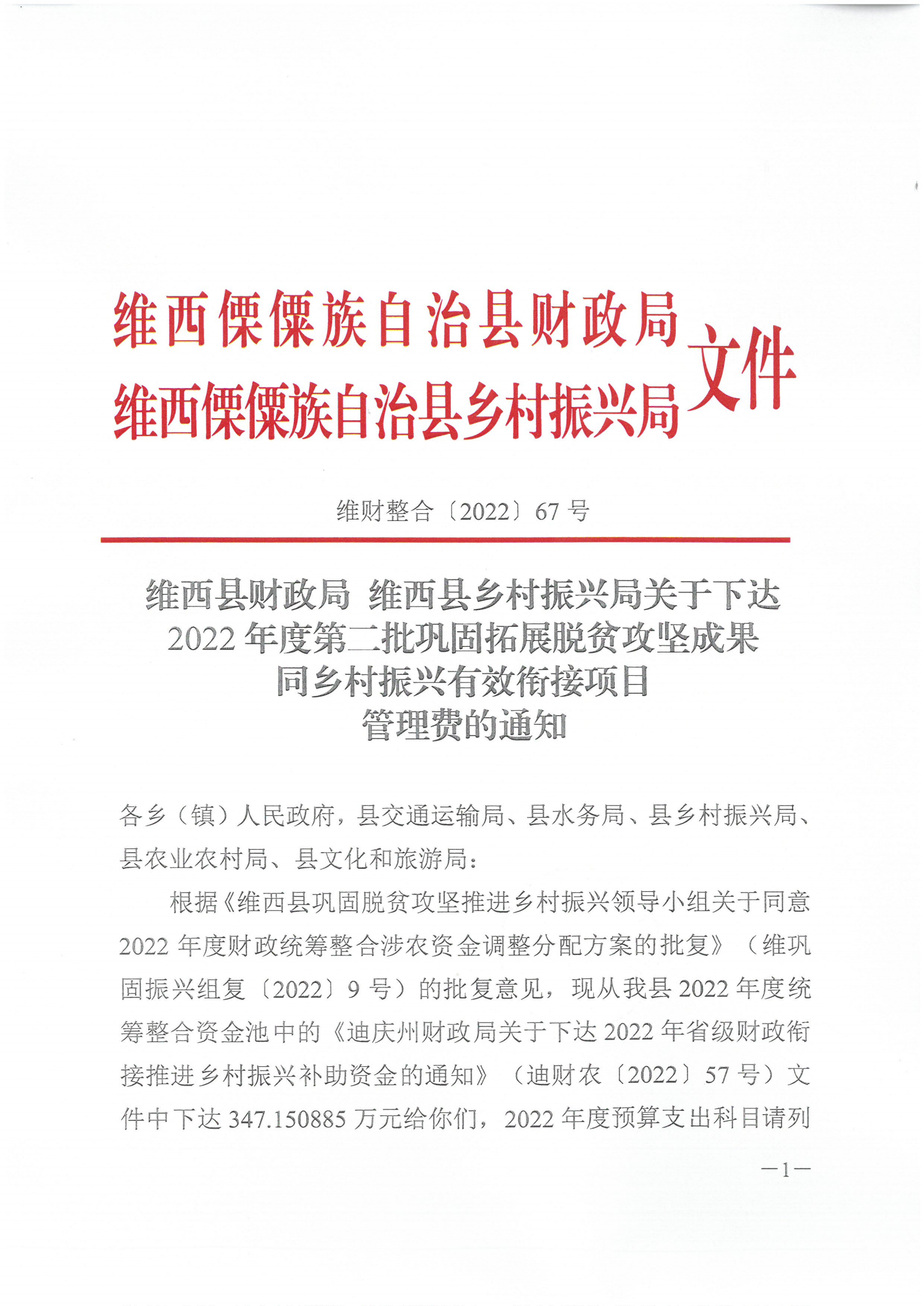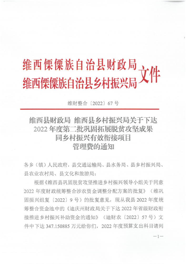 维西县财政局 维西县乡村振兴局关于下达第五批巩固拓展脱贫攻坚成果同乡村振兴有效衔接项目资金的通知