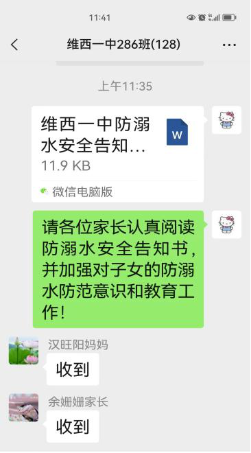 我校在加强学生在校期间平安管理的同时,各班利用班级微信群,通过发放防溺水致家长一封信、防溺水措施、签订防溺水承诺书等方式与学生家长加强联系,强化家长责任意识,要求家长切实肩负起监护责任,与学校一起守护儿童平安健康成长。
