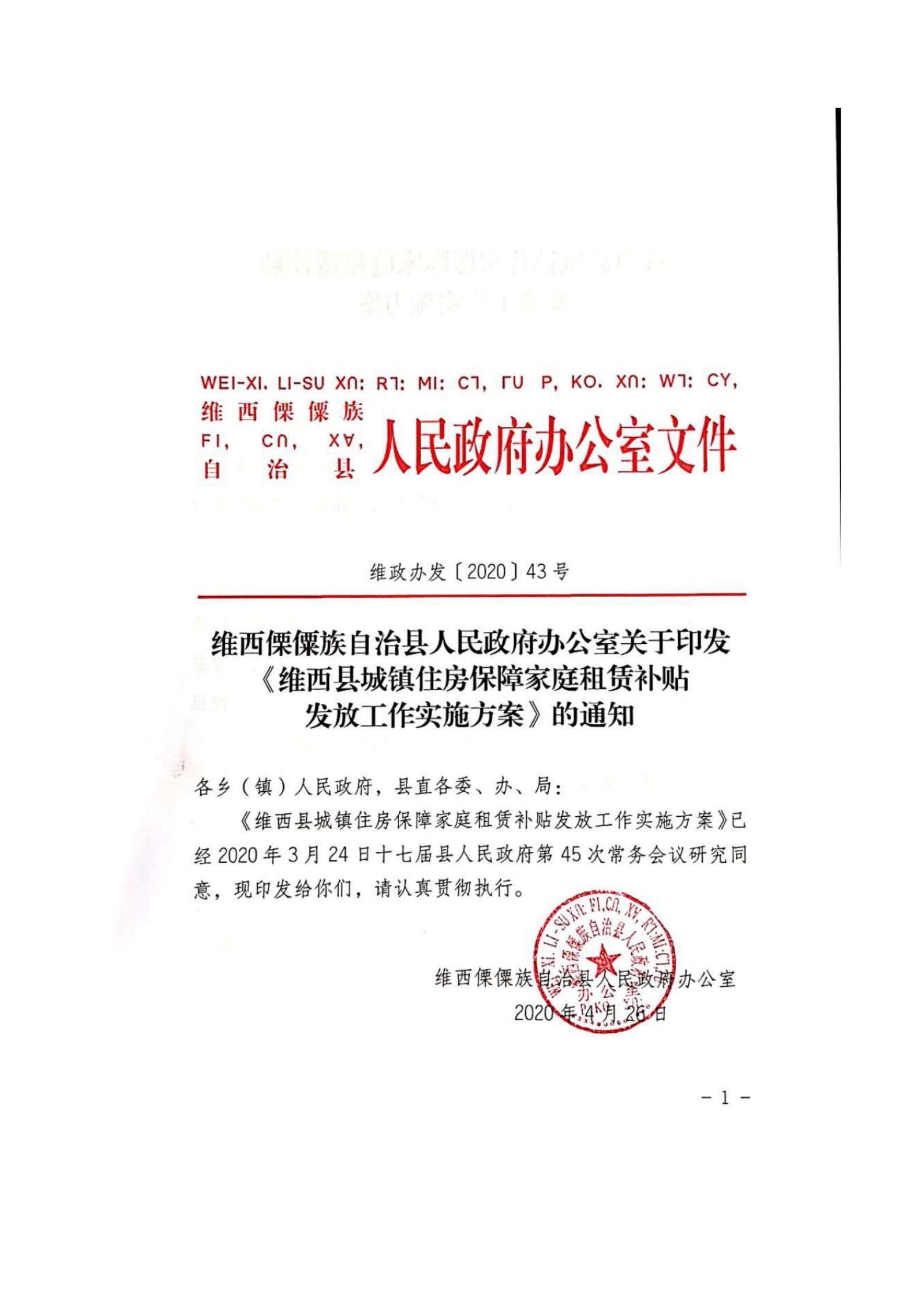 【维政办发】关于印发《维西县城镇住房保障家庭租赁补贴发放工作实施方案》的通知