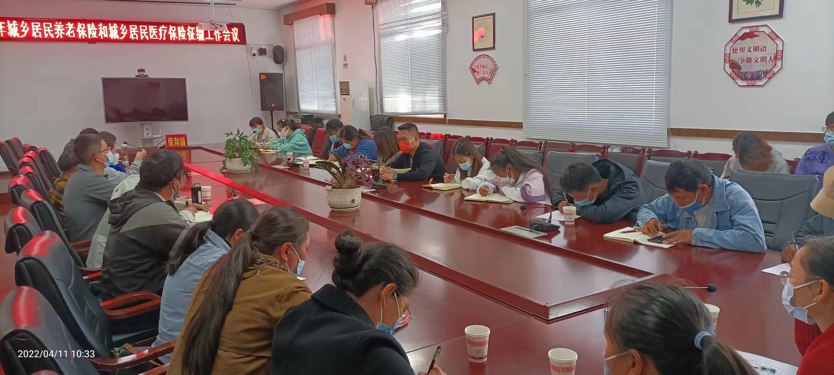 2022年4月11日,保和镇召开2022年度城乡居民养老保险和城乡居民医疗保险征缴工作启动会,镇纪委书记杨*、副镇长李*丹、社保所工作人员、各村(社区)总支书记及社保业务员参加会议。