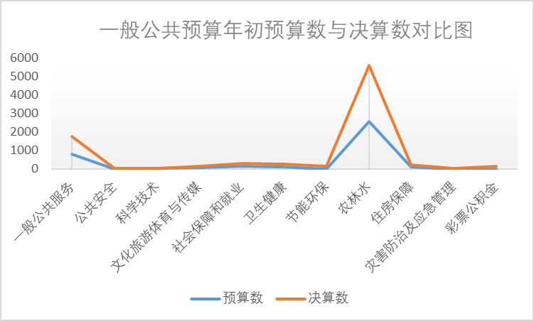 本年度一般公共预算年初预算数3766.87万元,较上减少149.11万元,减少率为3.96%,本年度一般公共预算决算数46589.24万元,比上年减少1788.54万元,减少率为27.74%。其中:一般公共服务收入完成965.67万元,为预算的119.94%,增长19.94%;公共安全支出5万元;科学技术收入完成11.24万元,为预算的68.41%,减少31.59%;文化体育与传媒收入完成73.66万元,为预算的157.58%,增长57.58%;社会保障和就业收入完成166.78万元,为预算的126.68%,增长26.68%;医疗卫生与计划生育收入完成124.19万元,为预算的107.93%,增长7.93%;节能环保支出124.87万元;农林水收入完成3050.09万元,为预算的119.61%,增长19.61%;住房保障收入完成100.75万元,与年初预算未发生变化;灾害防治及应急管理支出34万元,为预算的3400%,增长3300%;彩票公益金支出135万元。