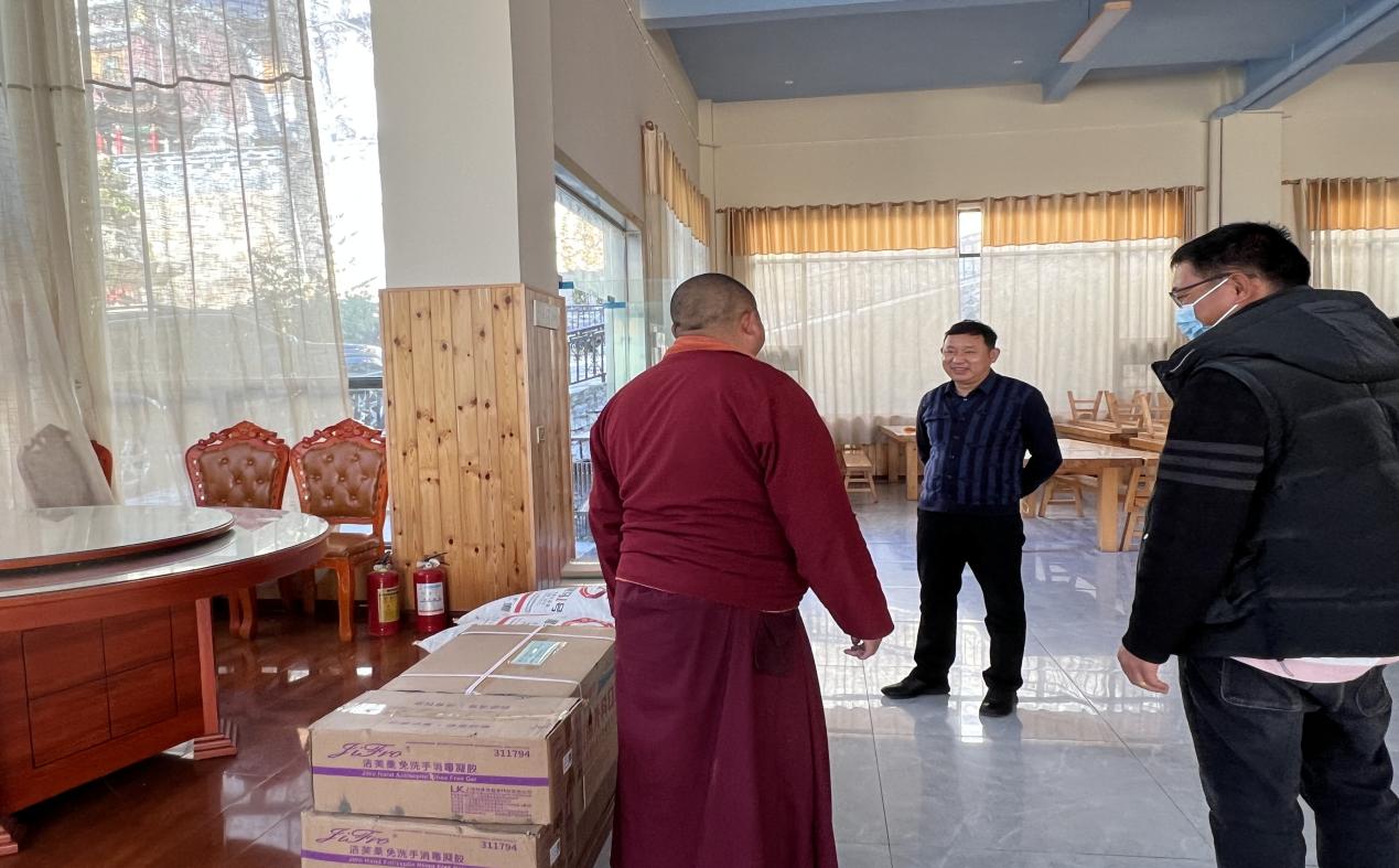 带着党和政府的关怀与深情,蒋智添同志为寿国寺送上面粉、面条、鸡蛋、口罩等生活物资及防护用品,并实地走访慰问了寿国寺民管会副主任斯郎邓珠、僧人唐宗强和困难僧人金玉生。