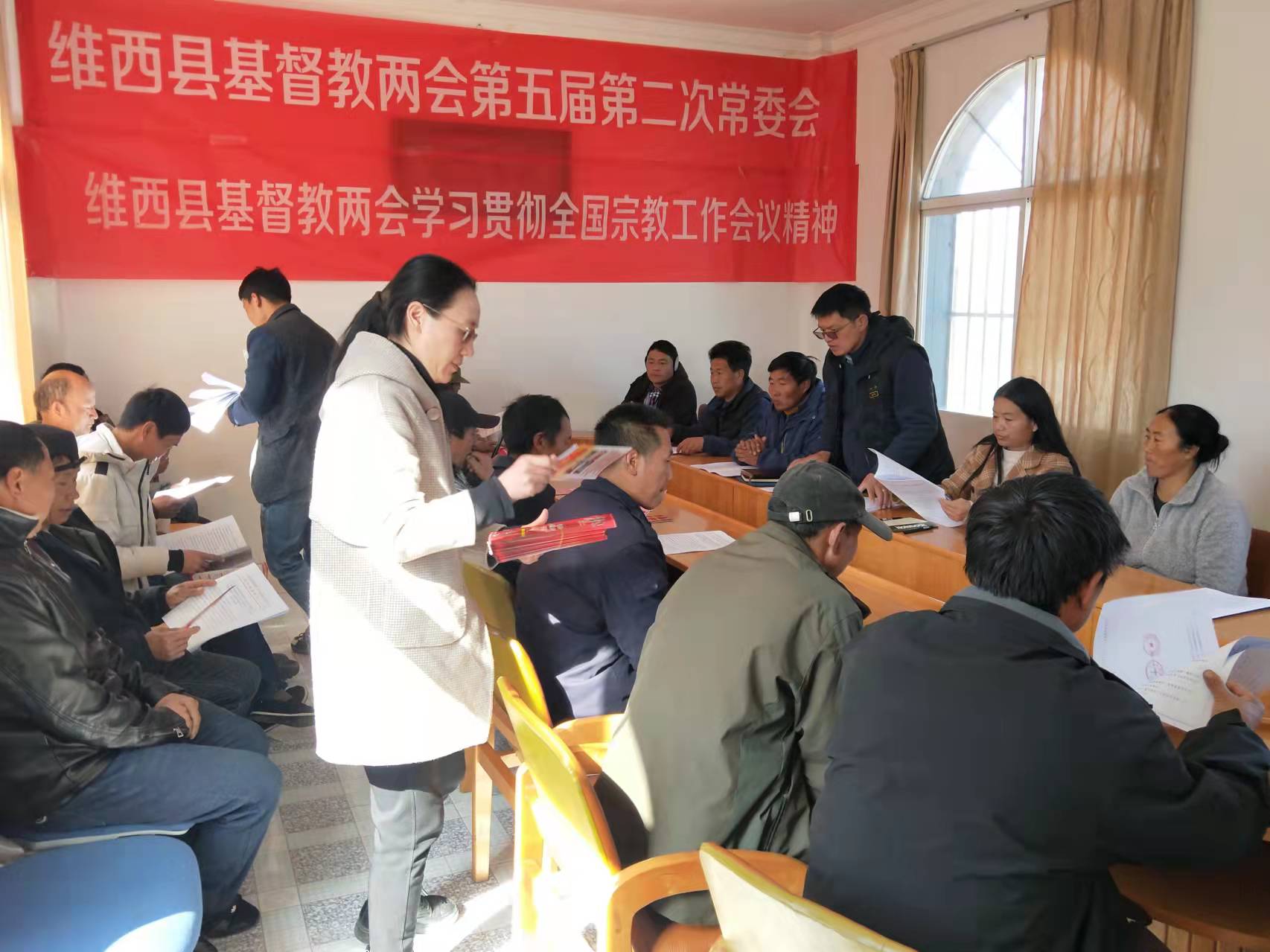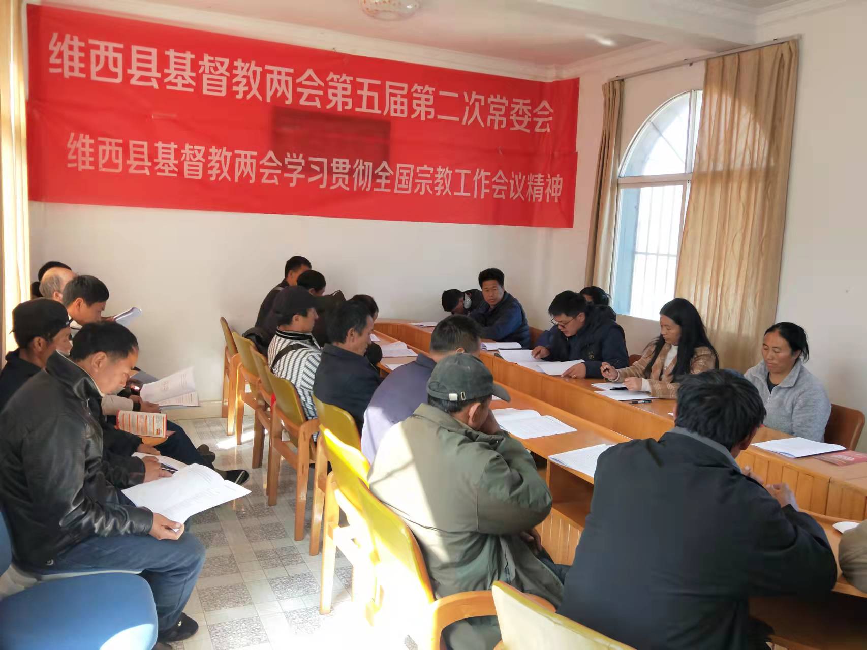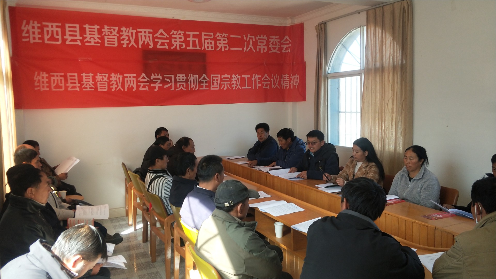 12月21日下午,维西县基督教两会组织召开了第五届二次常务委员会暨全国宗教工作会议精神集中学习会议。会议由县基督教两会主席雀卫军主持,县民族宗教事务局副局长、县基督教三自爱委会秘书长李迅珍及22名常务委员参加了会议。
