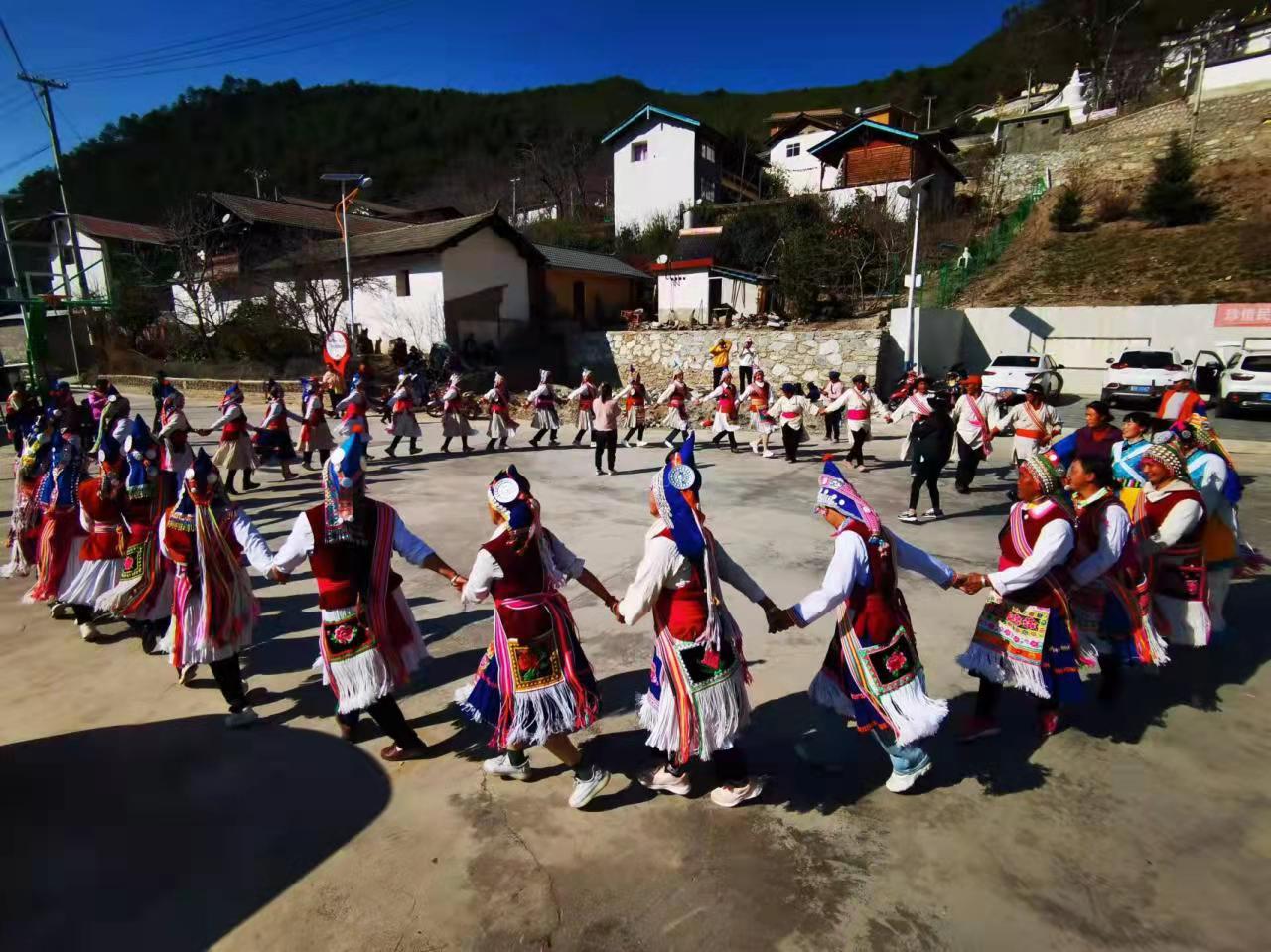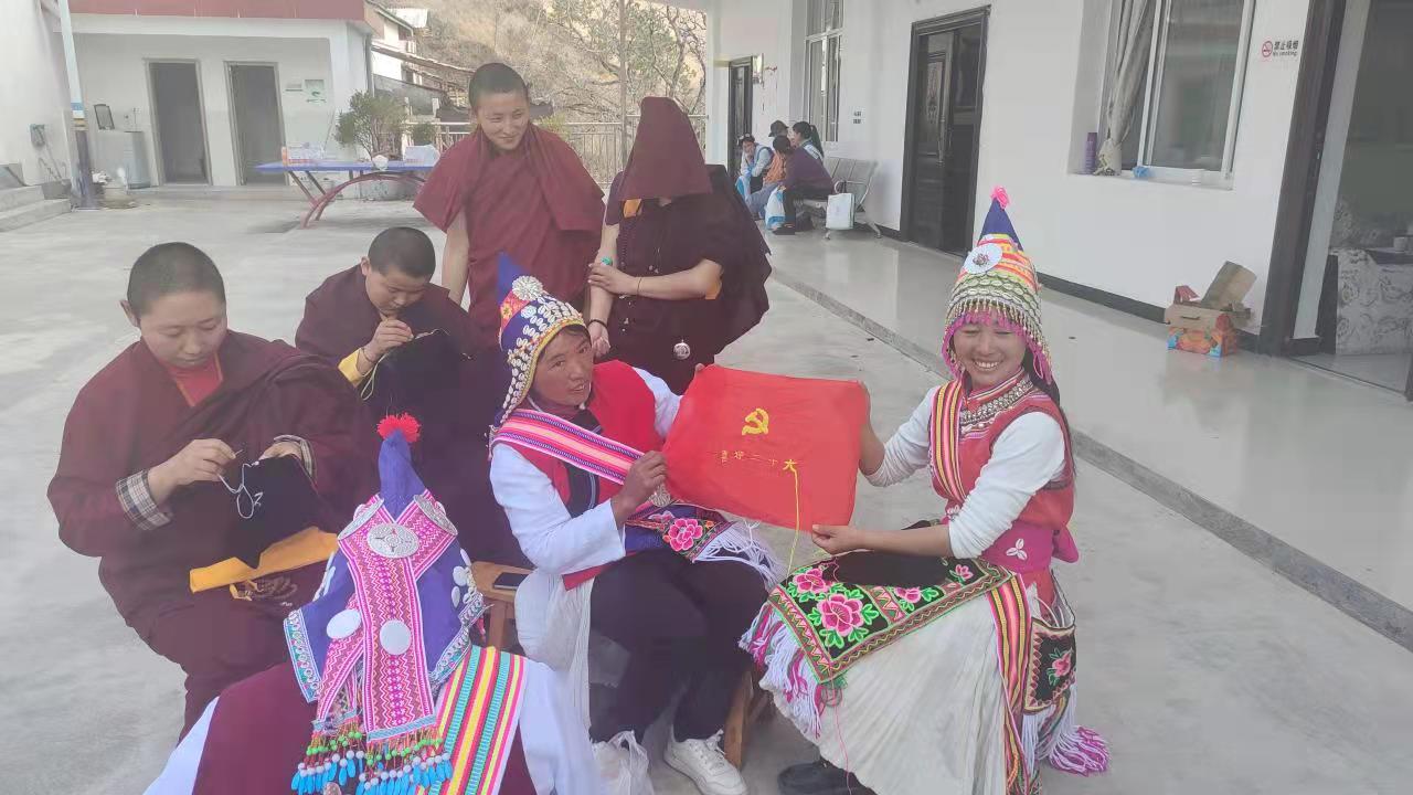 做好文化传承,促进民族团结示范创建。岔枝村妇联主席就傈僳族文化传承作了动员讲话。她指出,妇女同胞要树牢文化自信,挖掘本民族的饮食、歌舞、手工艺等文化内容。老一辈要将本领传授给年轻人、年轻人要继承和发扬光大。并以自身参加电商培训和互联网宣传傈僳文化的经验出发,分享了文化传承的意义和必要性,呼吁大家充分利用抖音、快手等平台宣传傈僳文化。在下午的活动中,从傈僳族传统棉线制作开始,岔枝村民族手工艺文化传承人手把手进行现场教学;傈僳族歌舞文化传承人现场为大家讲述了傈僳调子的发音、唱法、类别;阿尺木刮传承人现场进行了舞蹈教学。寿国寺在寺僧尼全程参与了此次活动,在现场教学活动环节,她们观摩了傈僳族织布的过程,拿起针线学习了傈僳族传统刺绣。他们纷纷表示,此次文化传承活动非常有意义,也重新认识了一起生活的傈僳族,了解了他们的文化,了解傈僳族是一个勤劳勇敢智慧乐观的民族。表示要和寺院周边妇女同胞一起共创民族团结,共同步入美好的明天。在传承人的共同努力下,大家一起刺绣完成了“喜迎二十大”刺绣作品。活动在欢乐、激情的傈僳打跳中画上了圆满的句号。同时也开启了岔枝村傈僳族文化传承的新起点。全村文化传承人也承诺,必将通过自身努力,传承发扬民族优秀传统文化,共促民族团结示范创建!