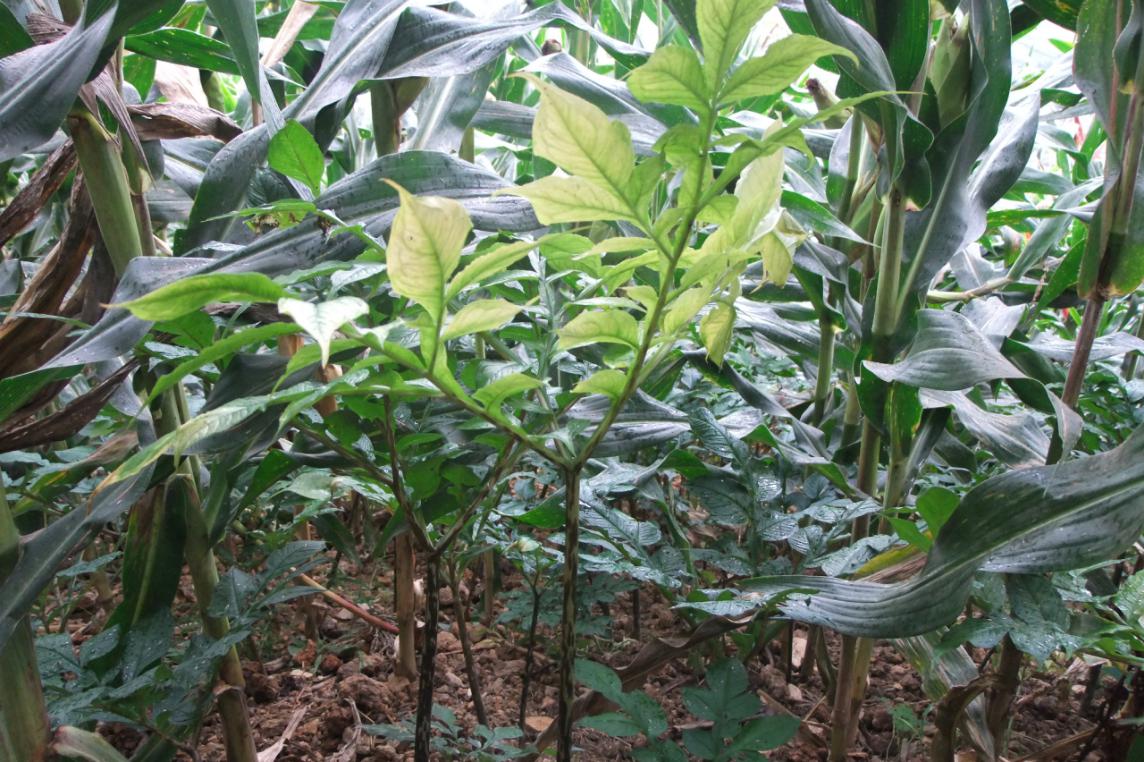 (3) 种芋在50克以下,以玉米套种栽培模式为主,一般为魔芋四行,玉米二行,魔芋种植规格为行距:20㎝,株距25㎝。玉米种植规格不变。