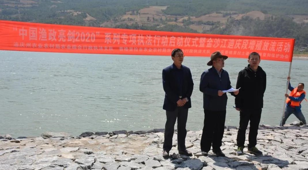 为做好2020年金沙江禁渔管理工作,切实保护金沙江水生生物资源和水域生态环境,2020年3月30日迪庆州人民政府在香格里拉市上江乡良美村举行金沙江迪庆段禁渔“中国渔政亮剑2020”专项执法行动启动仪式暨增殖放流活动。州委常委、副州长李迎宾出席活动并致词,州、各县(市)农业农村局和市场监管局主要负责同志、金沙江土著鱼类恢复保护协会全体会员、沿江派出所干警、全州农业综合行政执法人员出席启动仪式。