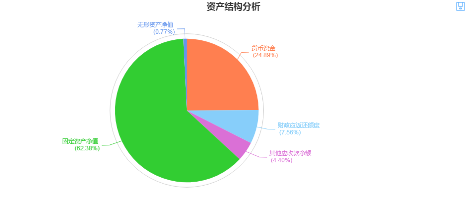 截至2019年12月31日,本部门资产总额2259.79万元,其中,1、流动资产832.74万元(包括货币资金5625217元、财政应返还额度1708349.26元及其他应付款993821.24元),占资产总计的比例为36.85%;2、固定资产1409.05万元,占资产总计的比例为62.38%;3、无形资产为18万元,占资产总计的比例为0.77%。