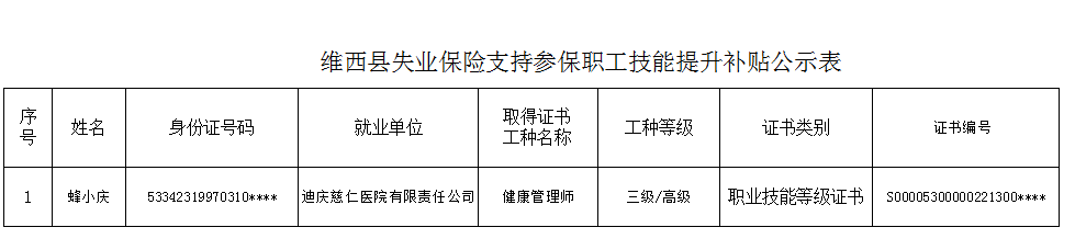 迪庆慈仁医院有限责任公司蜂小庆经昆明兴昆职业培训学校培训,培训工种为健康管理师,考核鉴定合格后,取得职业技能等级证书(三级/高级工)。根据《云南省人力资源和社会保障厅关于进一步落实失业保险稳岗扩围工作的通知》精神,拟发放职业技能提升培训补贴,补贴标准:健康管理师(三级/高级工)2000元(贰仟元整)。现予以公示(公示花名册附后),如对补贴人员有异议,请在公示期内向维西县劳动就业服务局反映,在公示期内如无异议,将如数支付培训补贴。