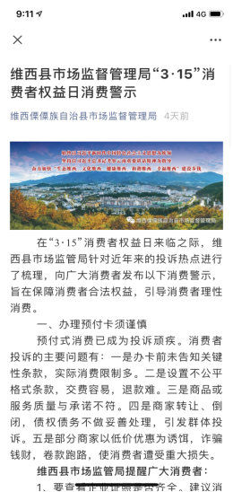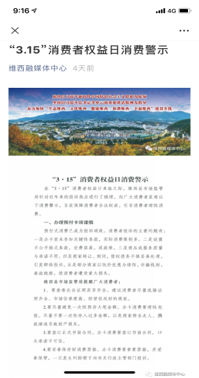 按照上级部门的工作安排并结合当前全县疫情防控工作的总体要求,为避免大量人群聚集,“3·15”国际消费者权益日当天我局未设现场咨询台,而是引导消费者以电话或信息的方式进行咨询。另外我局还通过维西县市场监督管理局微信公众号、县融媒体中心等媒介对消费者关心、关注的热点、难点、痛点问题进行了综合整理,形成提示、警示及时地向社会发布。力求通过各种形式的宣传和教育,不断提高消费者的维权保护意识,通过案例宣传不断强化经营者的自律意识和责任意识。同时做好值班值守,畅通12315投诉举报电话及相关投诉渠道,及时受理和依法处理12315投诉举报及其他渠道转办的投诉举报,及时化解消费纠纷。