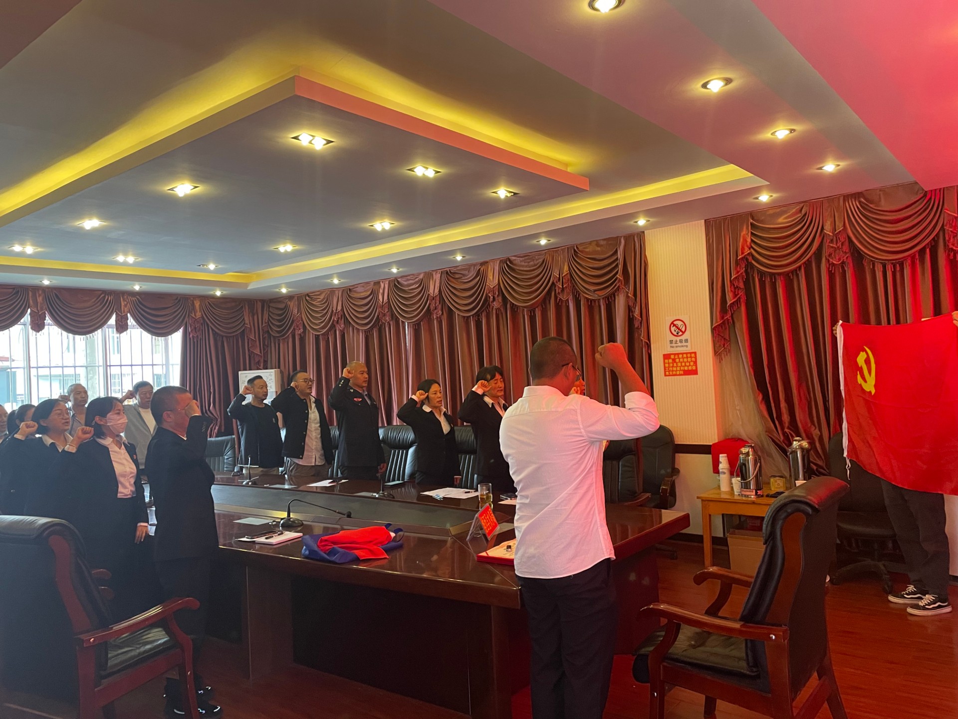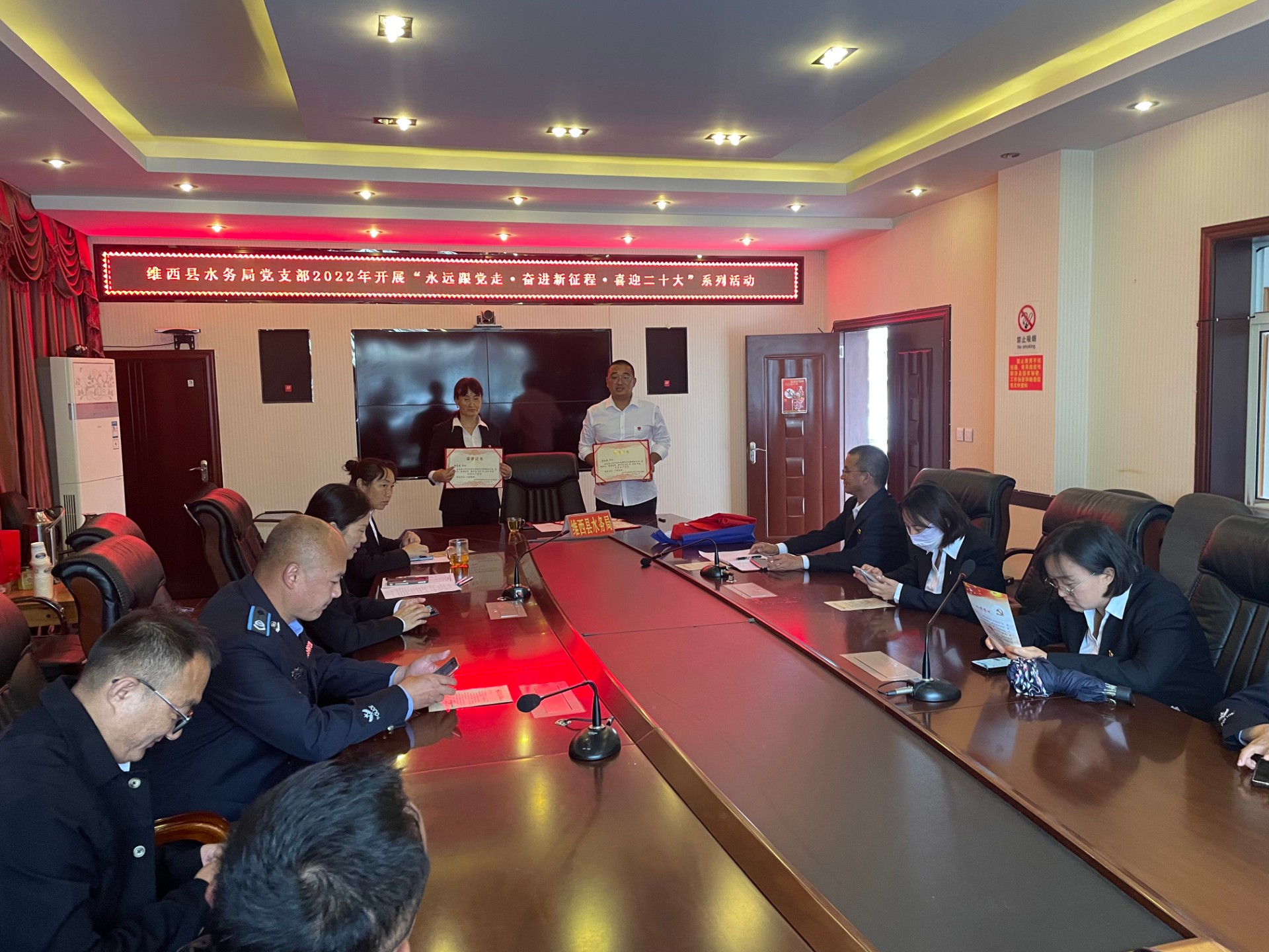 会上,在庄严的党旗下,水务局支部书记带领全体党员举起右手,重温入党誓词,宣誓入党时的庄严承诺和坚定决心;24名党员集体过了一次别具一格的政治生日,全体党员集体诵读部分党章,纷纷表示在今后的工作上和生活上坚决以党规党章作为工作指南和行为准则。