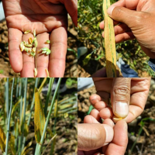 镇农综中心工作人员到海尼村格登组进行查看,发现多个地块出现锈病,少数已严重影响麦穗无法灌浆,进而导致本年产量降低。经了解,此次锈病发生原因有以下几种:一是品种原因,此次锈病多发生在相同品种地块,可能由于该品种抗病性较低而导致;二是气候原因,今年三四月以来降雨较多且后期快速回温,此类气候极易发生锈病;三是防治不及时,锈病常发生在拔节期,未及时查看铲除病原和未及时喷洒防治药物会导致传播蔓延。由于锈病是真菌引起的麦类疾病,所以极易传播发展,应及时统防统治,减少不必要的产量损失。