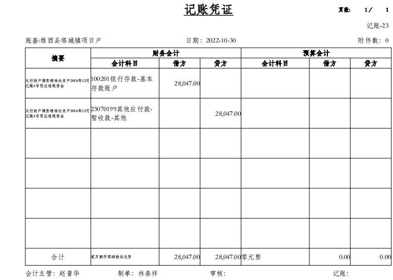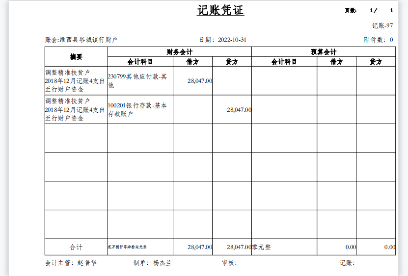 根据维审报【2022】7号文件要求,我镇涉及问题为:将易地扶贫搬迁管理费用于与易地扶贫搬迁无关经费的支出2.8047万元,具体为:2018年12月记账4号违规支出广告费0.336万元、旗杆0.25万元、门牌0.55万元,2018年12月记账6号支出接待费1.6687万元。我镇财政所于2022年10月30日已调账处理,将违规资金2.8047万元从行财户办公费中列支,将易地扶贫搬迁管理费用于与易地扶贫搬迁无关经费支出2.8047万元归还原渠道。