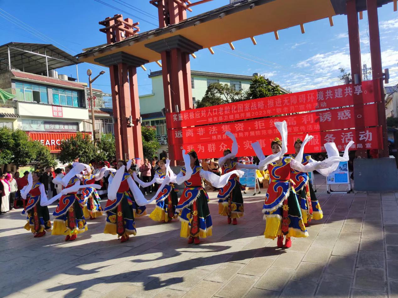 为弘扬中华民族敬老、爱老、助老的传统美德,丰富广大老年人的精神文化生活,引导全社会都来关心老年人,营造良好的社会氛围。根据《云南省老龄工作委员会转发开展 2023 年全国“敬老月”活动的通知》(云老龄委发〔2023〕1 号)精神,10月20日维西县卫生健康局联合县妇计中心、保和镇卫生院、保和镇部分老龄协会,在念萨街牌坊处开展全国第14个“敬老月”宣传及义诊活动。此次活动以“实施积极应对人口老龄化国家战略,推进无障碍环境共建共享”为主题,并将积极开展防范养老领域非法集资宣传教育、持续推进“智慧助老”行动贯穿到活动始终。