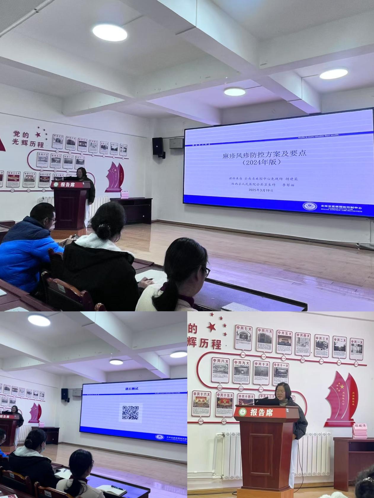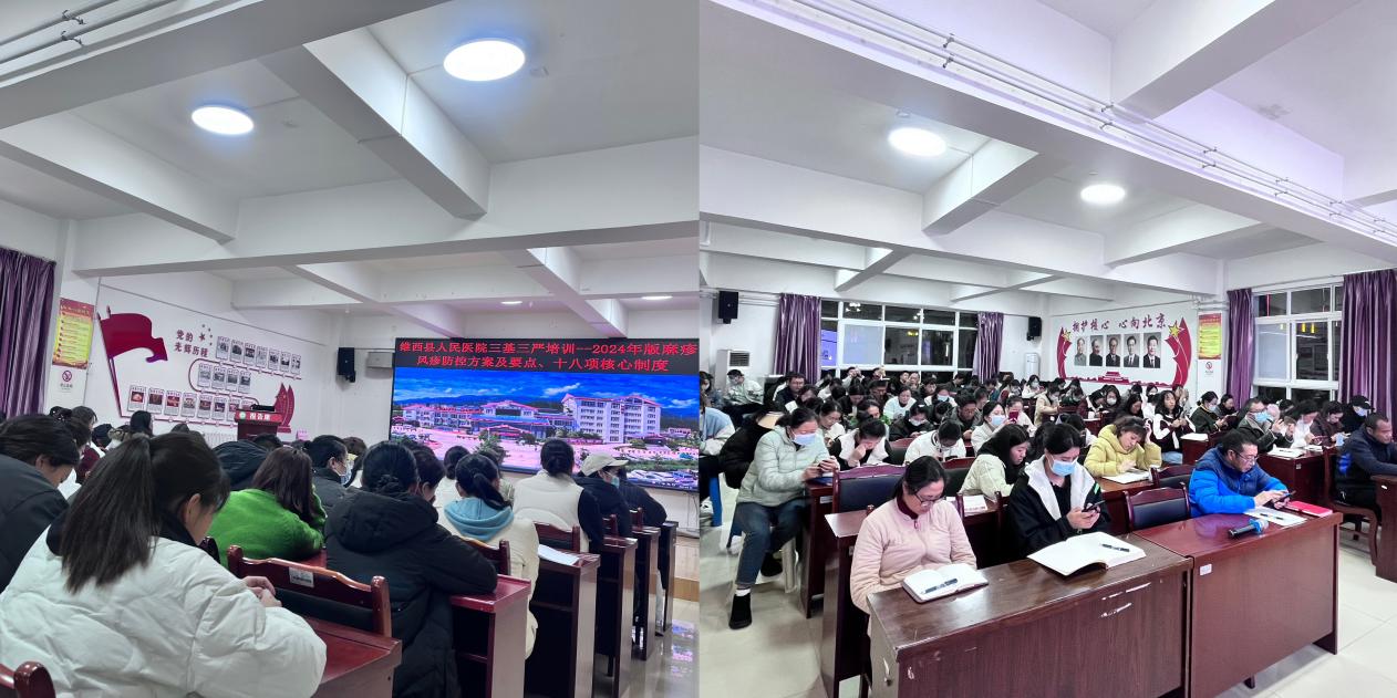 二、为进一步提升维西县人民医院医务人员的专业素养和医疗服务水平,强化对麻疹风疹防控及医疗核心制度的掌握,2025年3月19日19:00--21:00,维西县人民医院组织全院医务人员在三楼大会议室开展了关于2024年版麻疹风疹防控方案及要点、十八项核心制度的三基三严培训,参与此次培训医护人员共215人次。