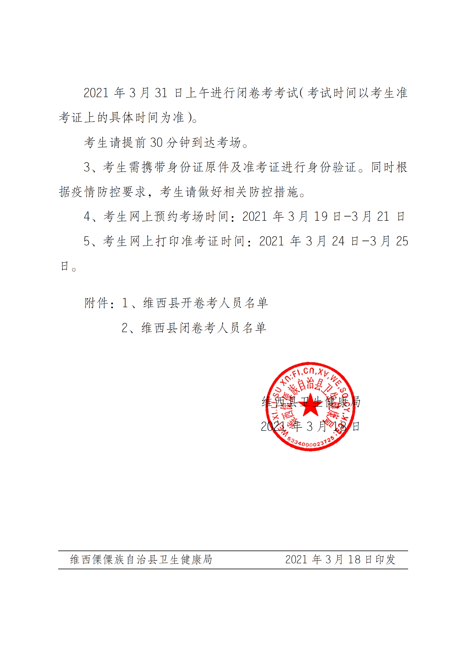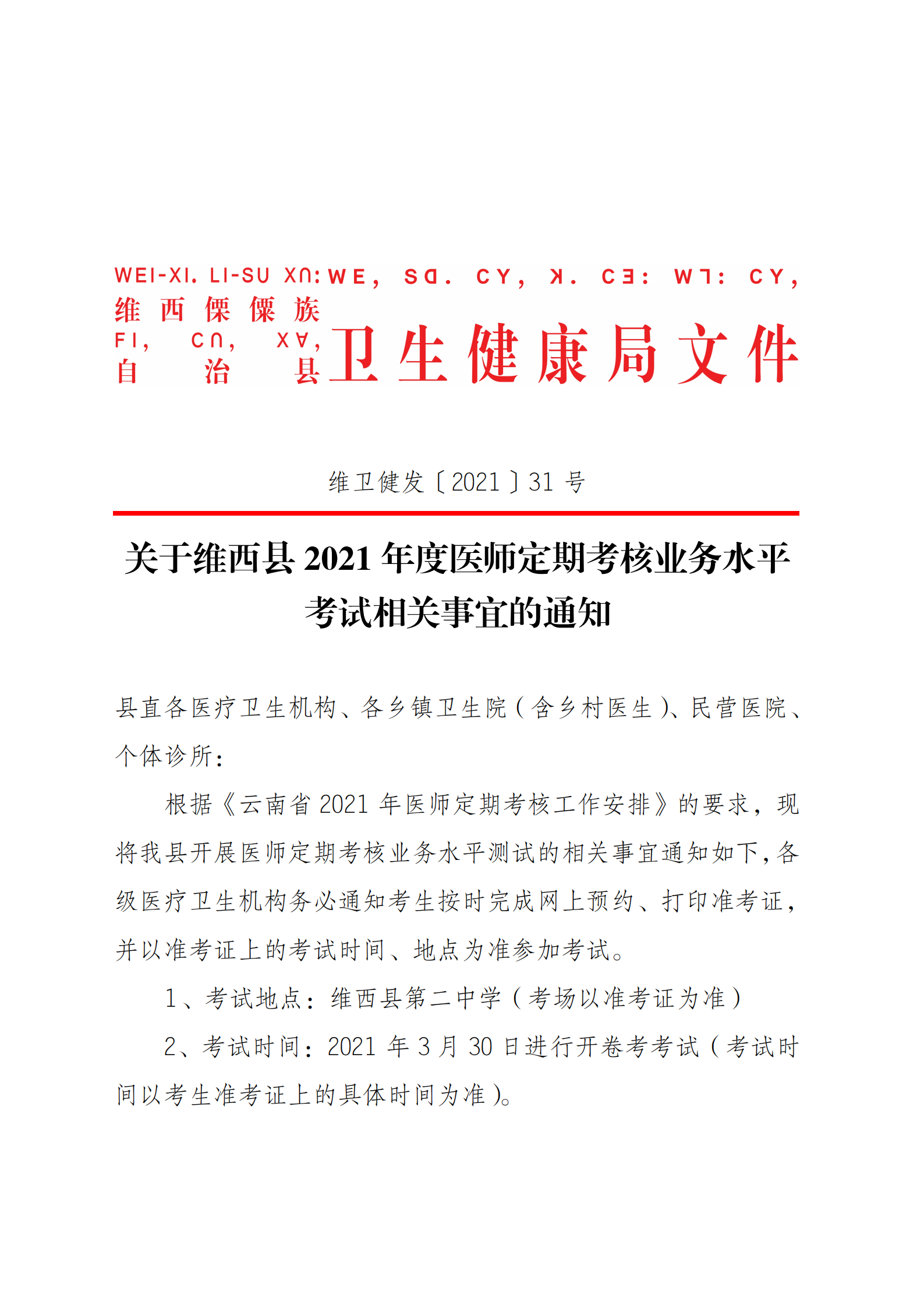【通知公告】关于维西县2021年度医师定期考核业务水平考试相关事宜的通知