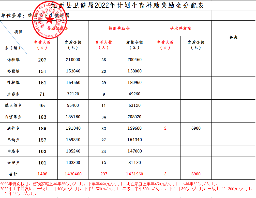 根据全县各乡镇人民政府2022年计划生育家庭“两项制度”申报情况、上级财政部门相关文件及资金管理发放规定,经维西县卫生健康局人口与家庭发展股审核、统计,财务再次核实,2022年维西县符合享受计划生育家庭“两项制度”对象共计1647人,其中奖励扶助对象1408人,特别扶助对象(死亡、伤残)237人,特别扶助对象(其他家庭)2人,共涉及资金286.926万元。经局务会研究通过:截止2022年8月15日,我局已将2022年度计划生育家庭“两项制度”资金286.926万元,按照各乡镇收集上报的享受对象个人社保卡账户进行发放。