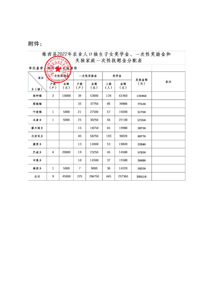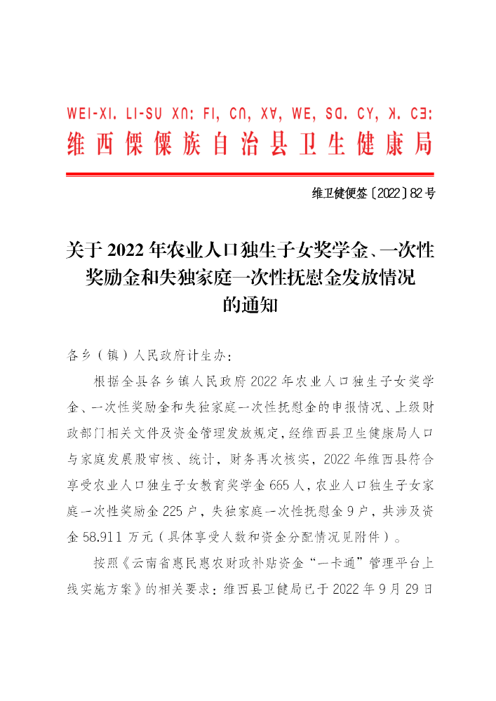 关于2022年农业人口独生子女奖学金、一次性奖励金和失独家庭一次性抚慰金发放情况的通知