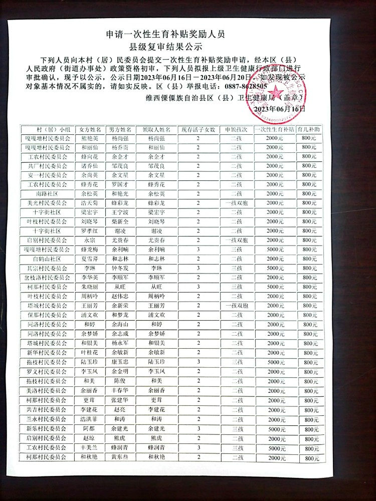 维西县申请一次性生育补贴奖励人员 县级复审结果公示20230616