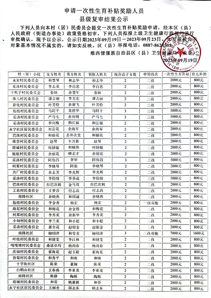 申请一次性生育补贴奖励人员 县级复审结果公示20230926