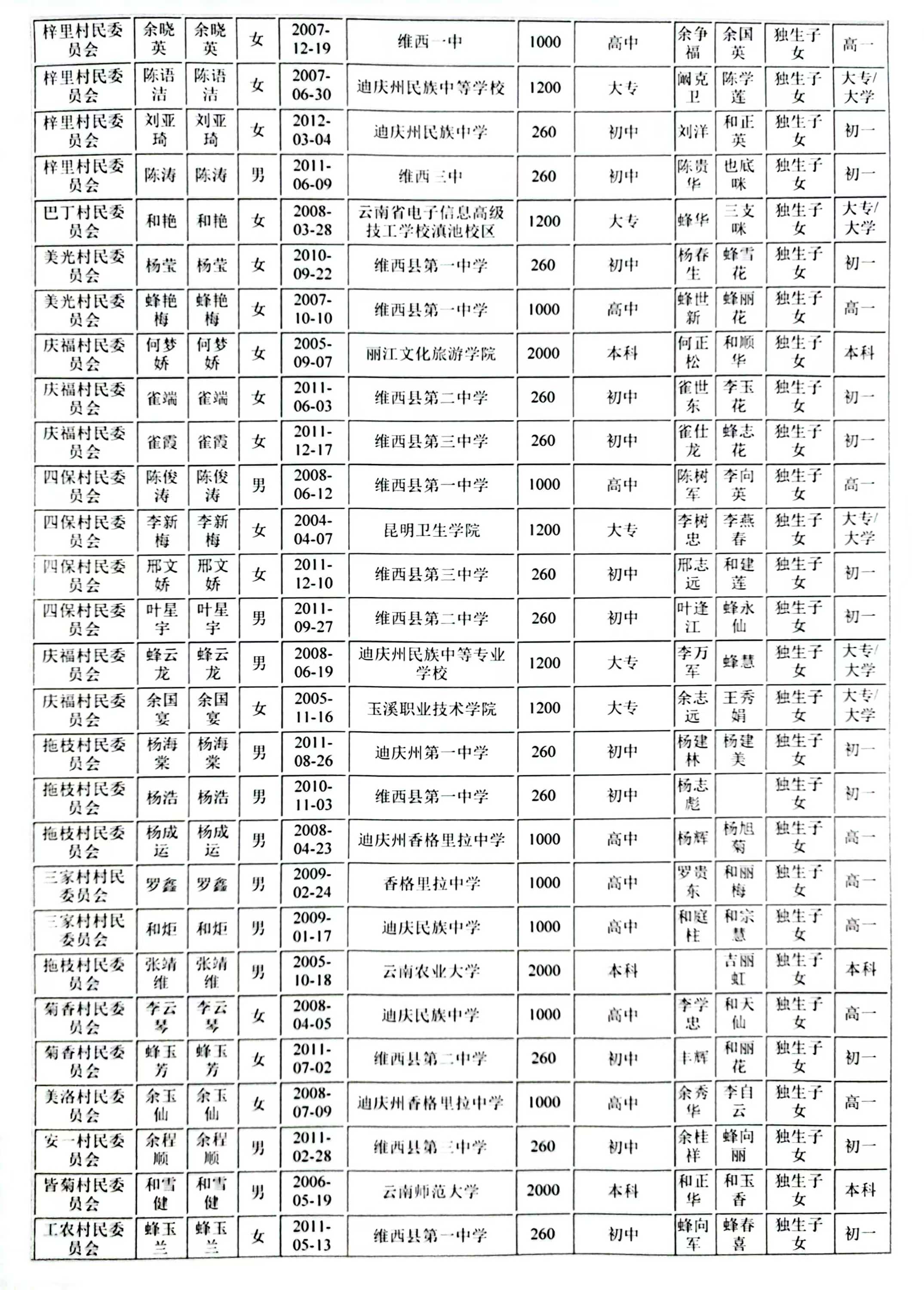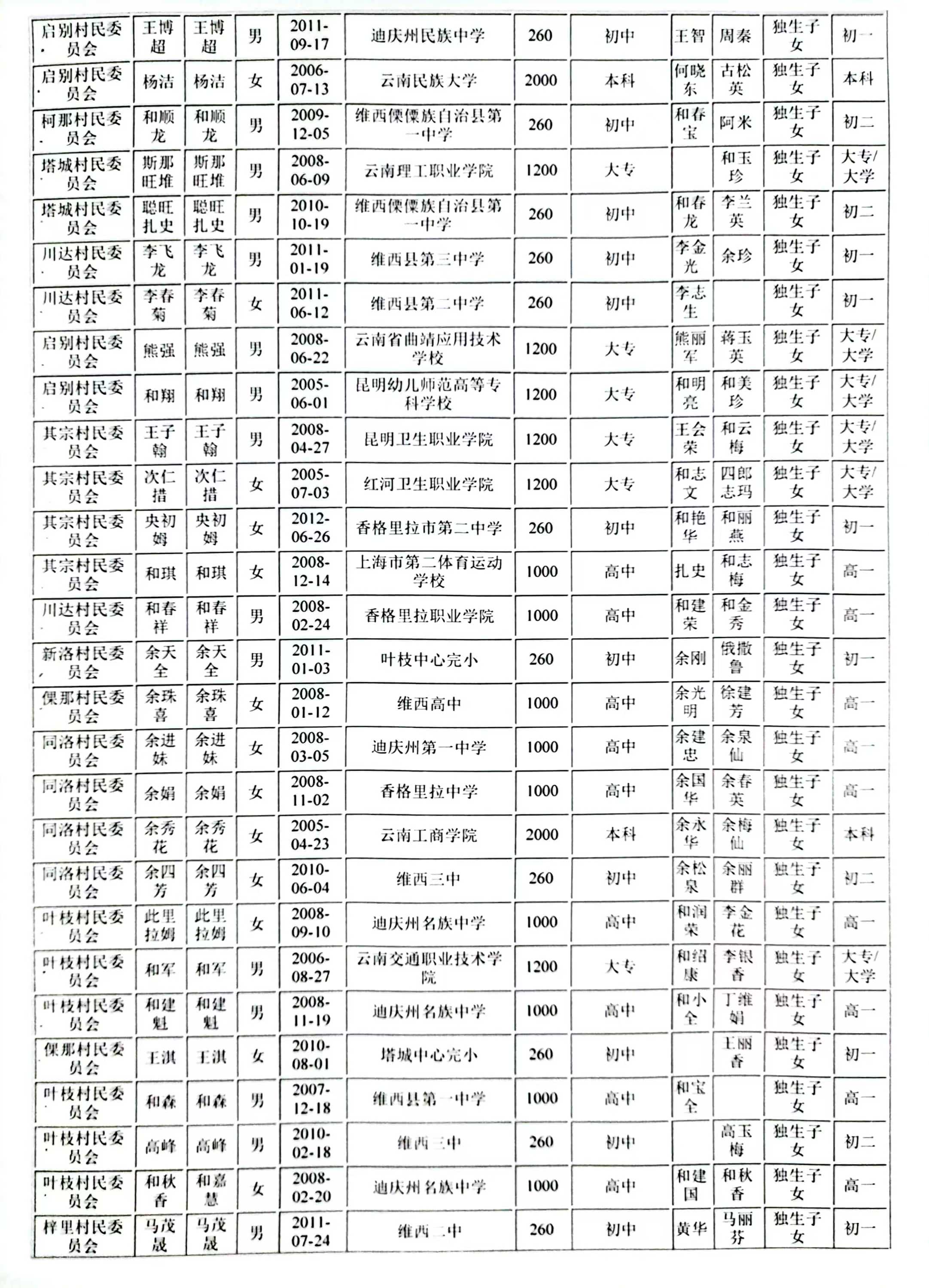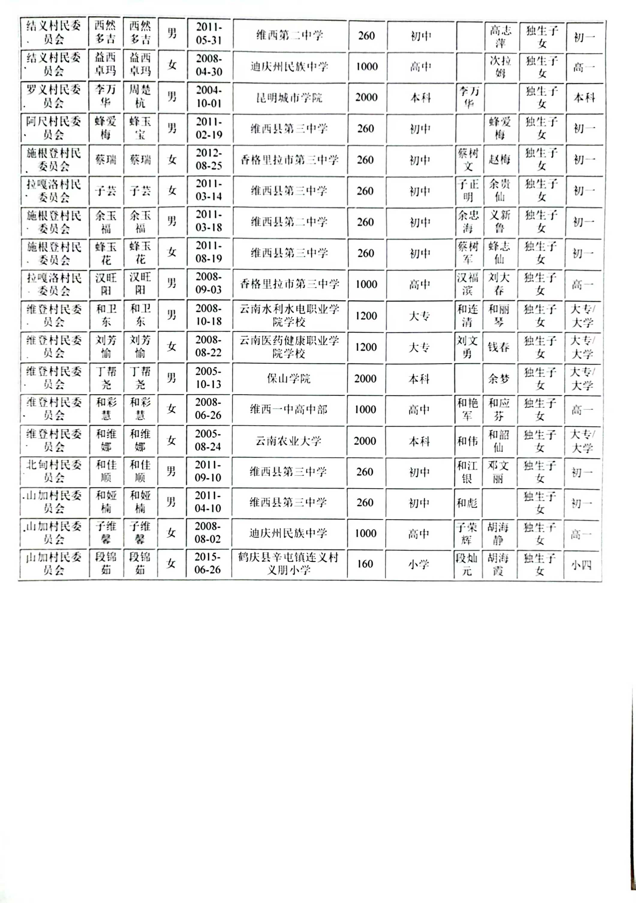 云南省(维西县)农业人口独生子女、计划生育特殊家庭子女教育奖学金公示表区县审核结果公示