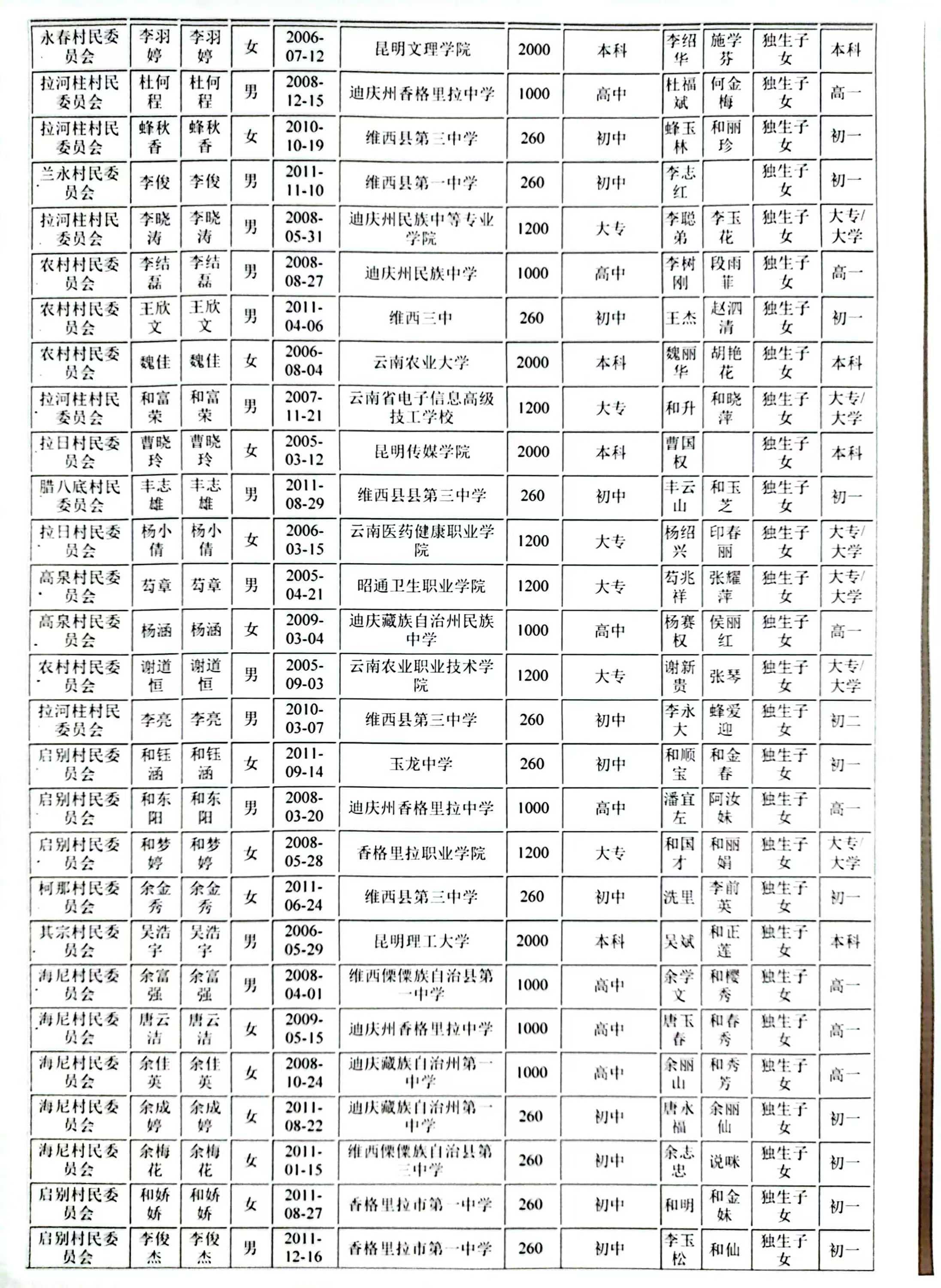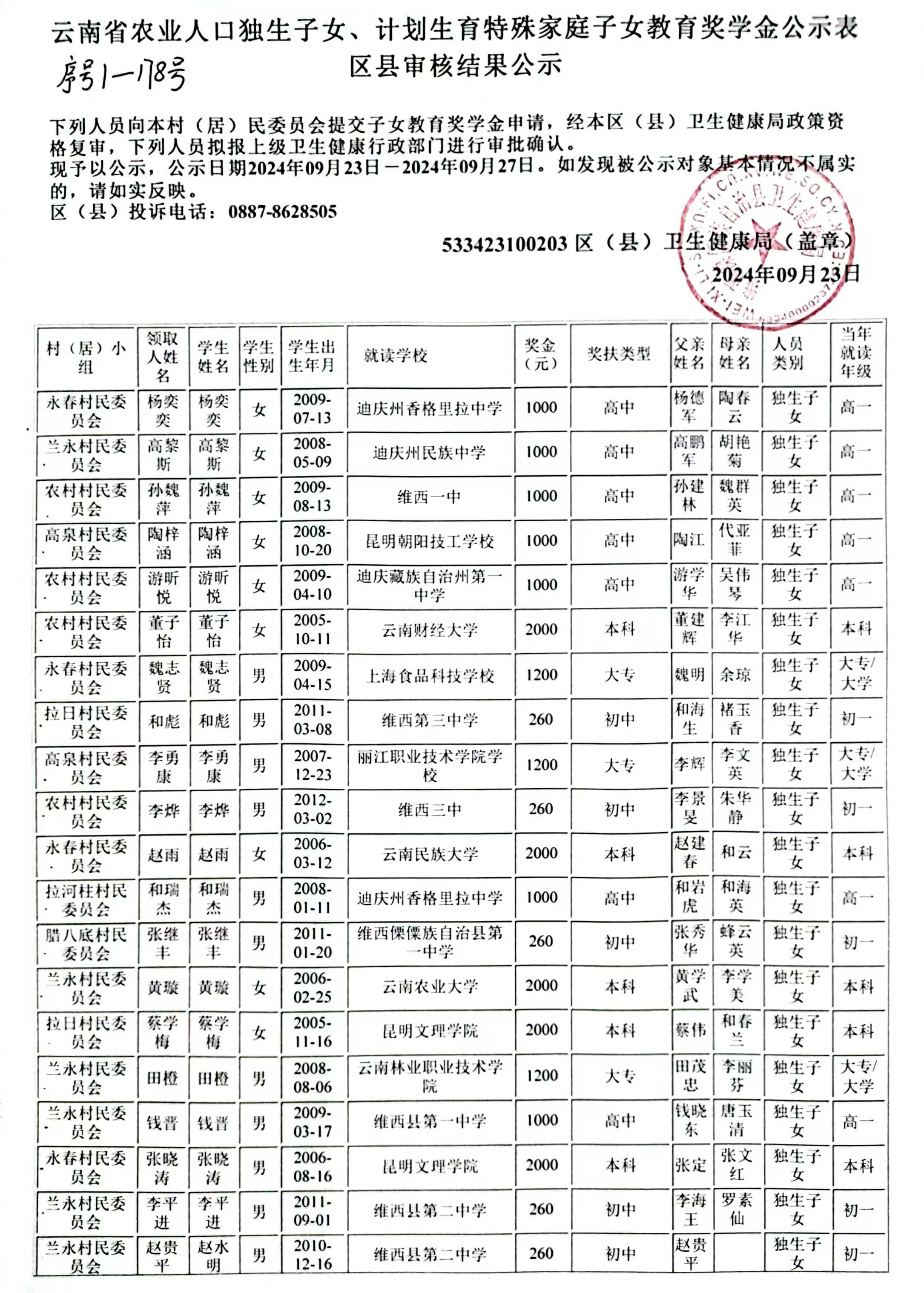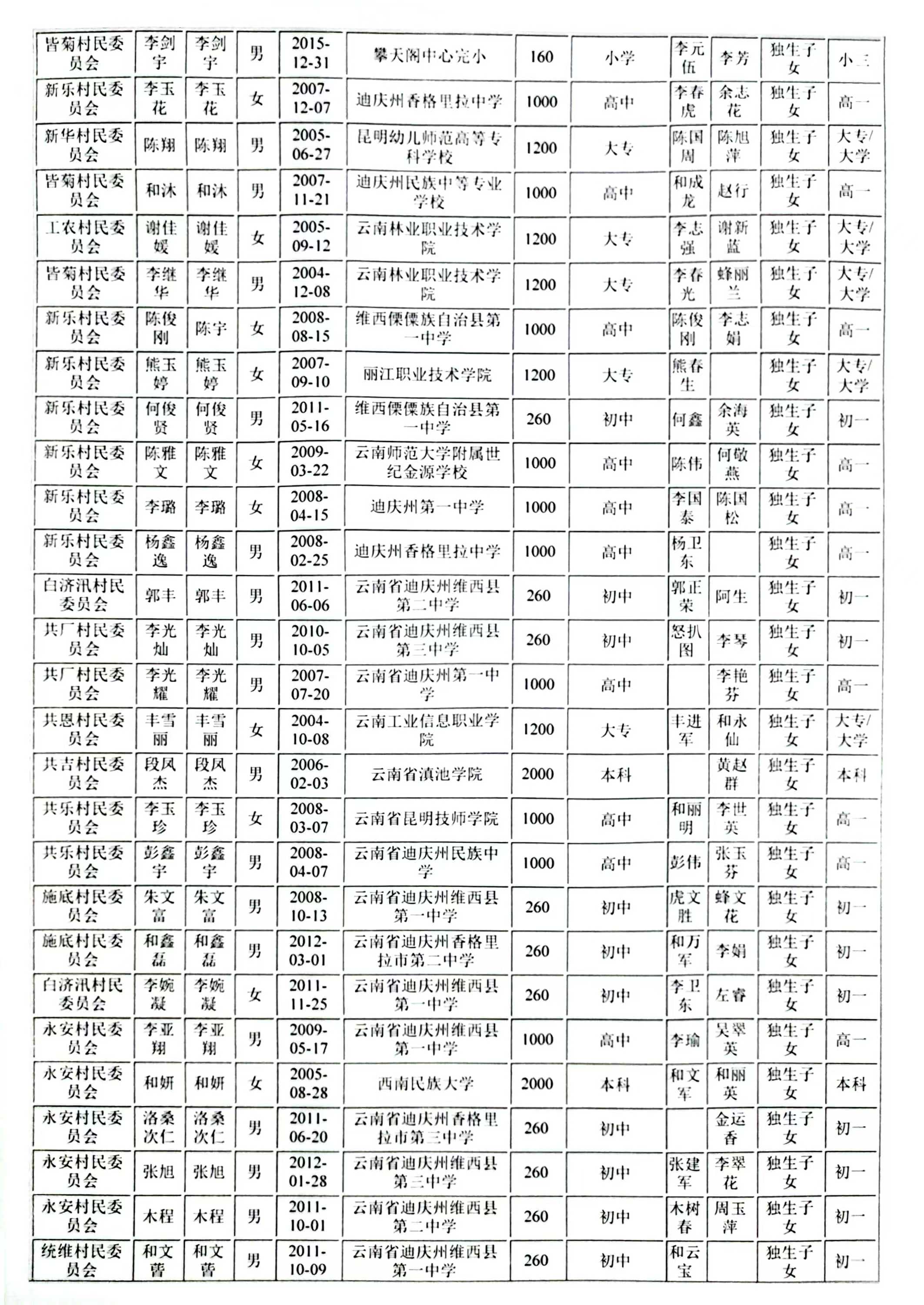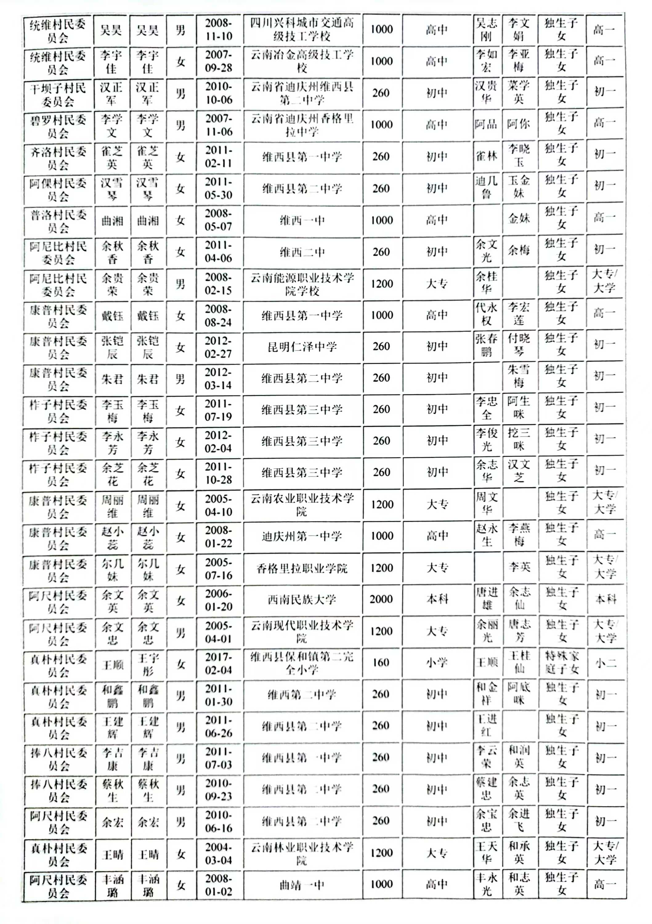 云南省(维西县)农业人口独生子女、计划生育特殊家庭子女教育奖学金公示表区县审核结果公示