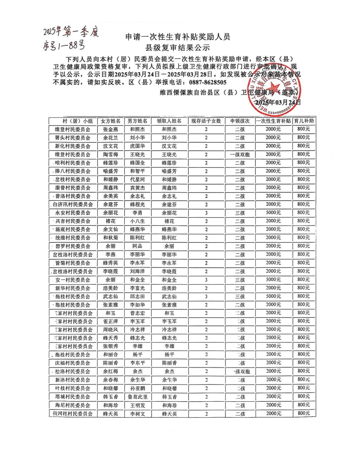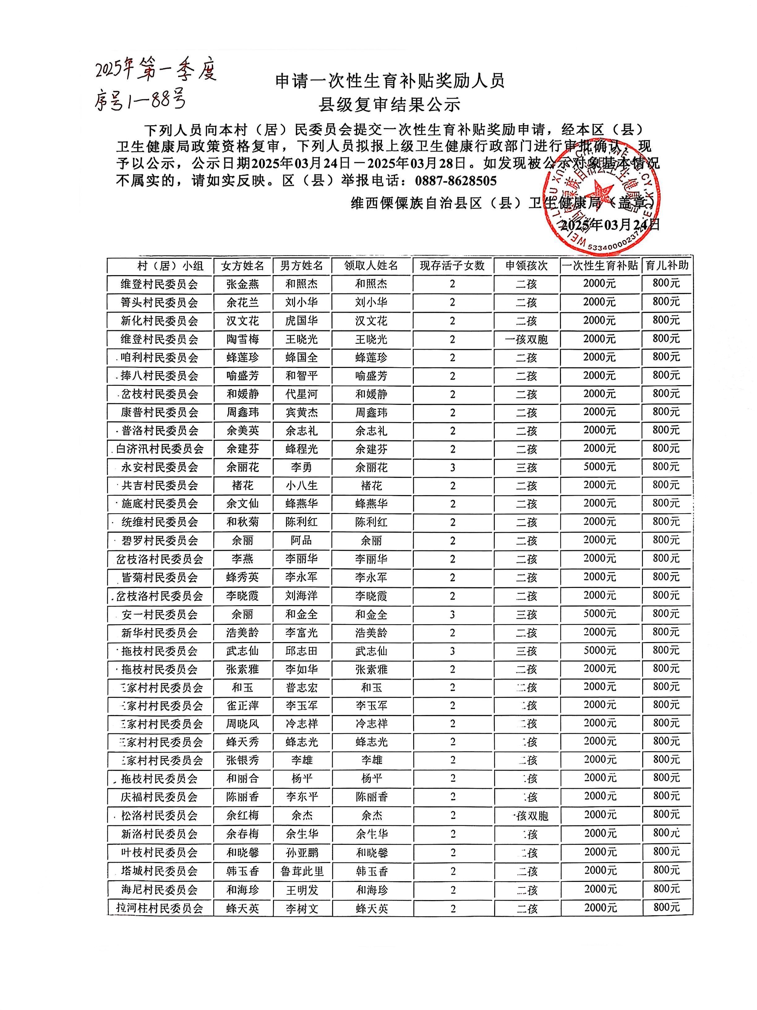 申请一次性生育补贴奖励人员县级复审结果公示2025年第一季度1-88号