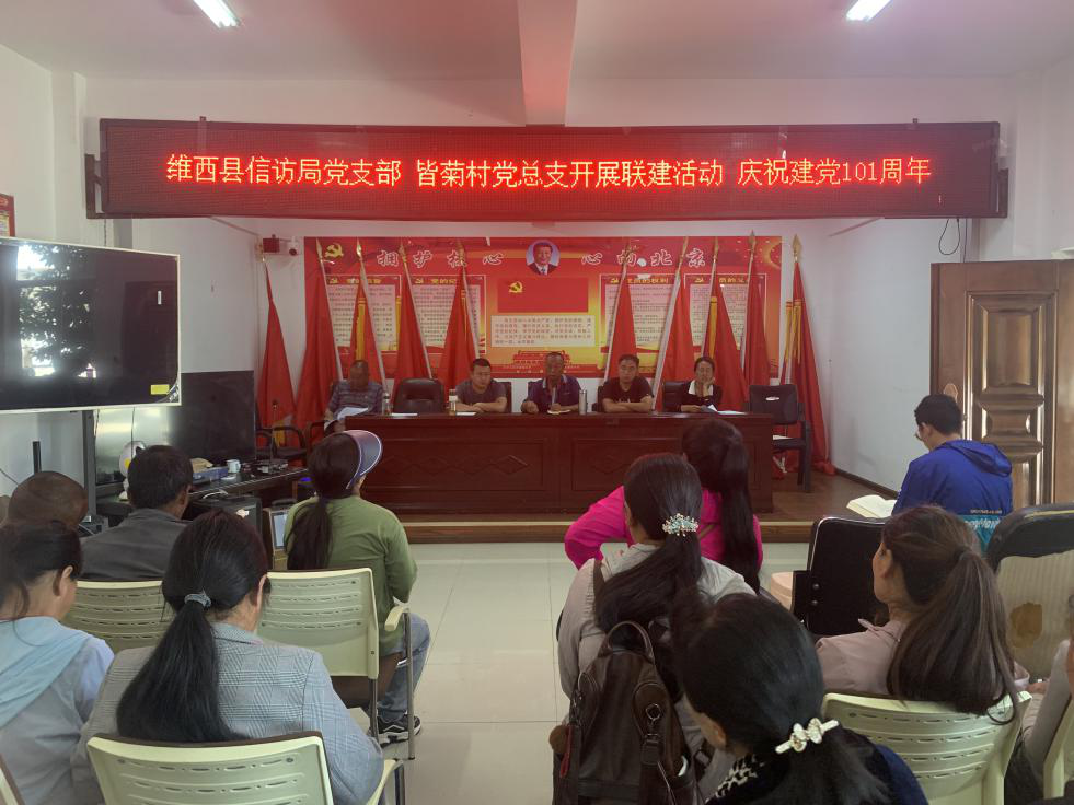 维西县信访局于2021年9月底正式调整攀天阁乡皆菊村为挂钩单位,自调整以来维西县信访局认真履职尽责及时派出一名副局长驻皆菊村协助开展工作,维西县信访局党支部还与皆菊村党总支进行了多次结对联建。为着实与挂钩村联建支部开展好“双建双推”活动,维西县信访局于2022年7月16日到皆菊村开展了一系列的联建活动,全体党员参与此次活动。