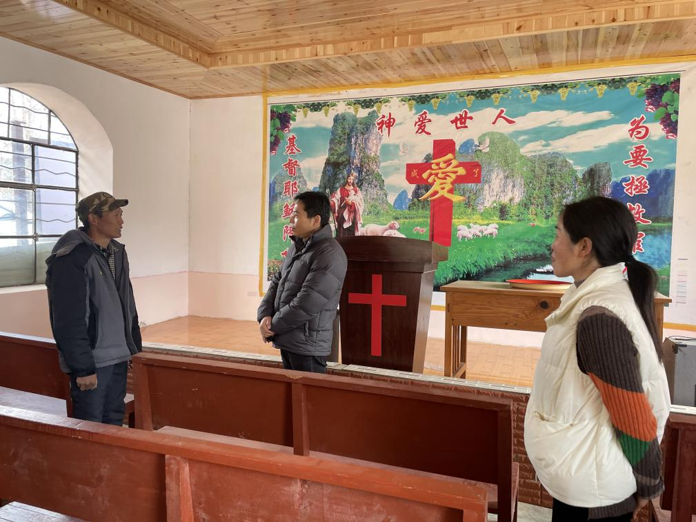 在庆福村草坝子基督教堂,姬兴江书记询问了教职人员日常生产生活情况、疫情防控情况,并要求教职人员要高举社会主义旗帜,坚持党对宗教工作的领导,持续推进宗教中国化;要认真践行宗教工作“四条标准”,真正做到“政治上靠得住、宗教上有造诣、品德上能服众、关键时候起作用”,继续在维护全乡社会稳定、宗教和顺有序、维护民族团结做出新贡献。