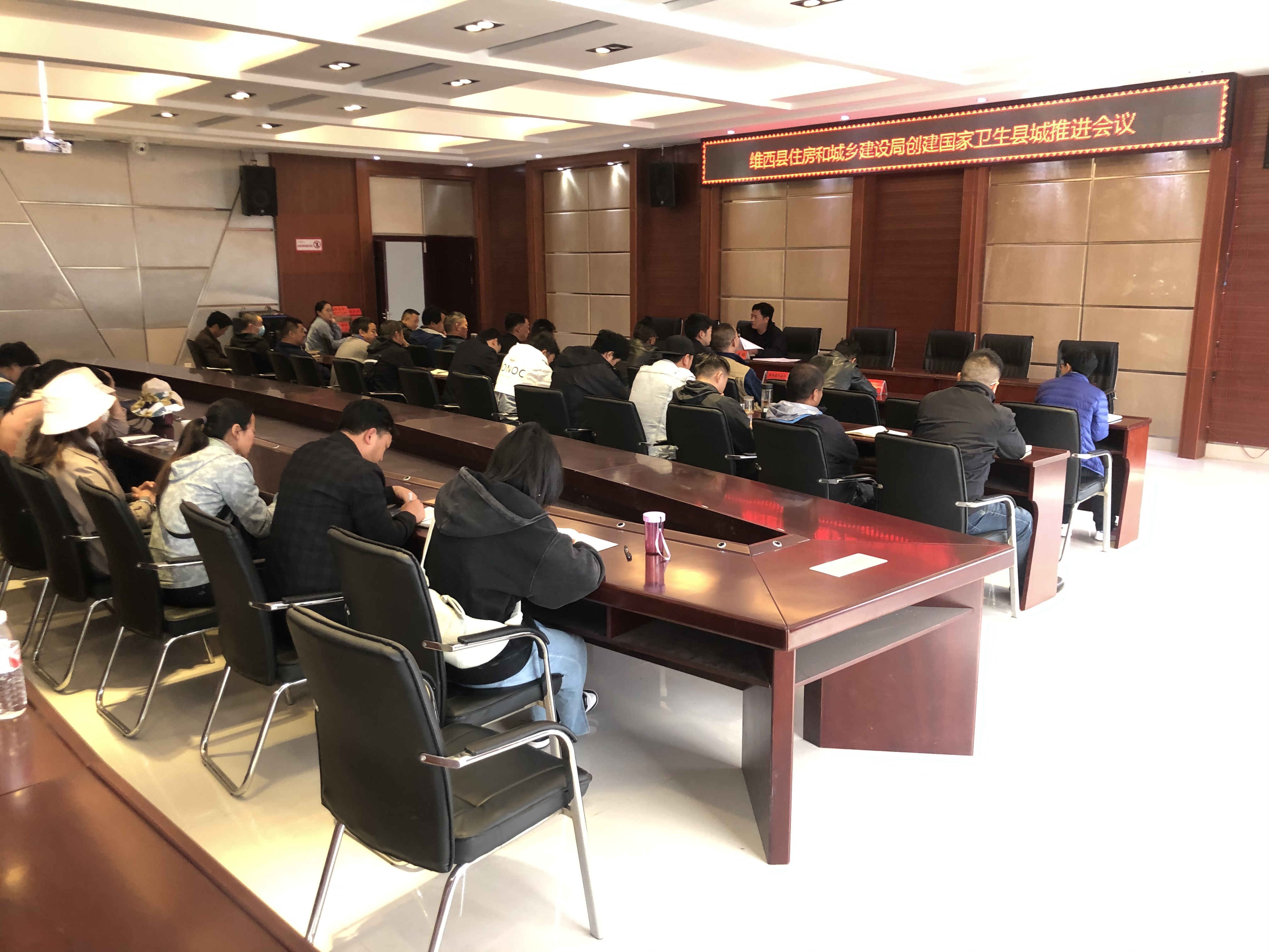 局全体职工参加专题会议,根据王以志书记在《中共云南省委办公厅云南省人民政府办公厅关于表扬2020年云南省推进爱国卫生“7个专项行动”工作突出县市区的通报》(云办发电﹝2021﹞47号)上作出重要批示和县委书记格桑纳杰同志指示,为坚决完成今年成功创建国家卫生县城目标任务,维西县住房和城乡建设局将项目细化分配到个人及各股室,责任分工明细确定到个人,更好地完成目标任务。