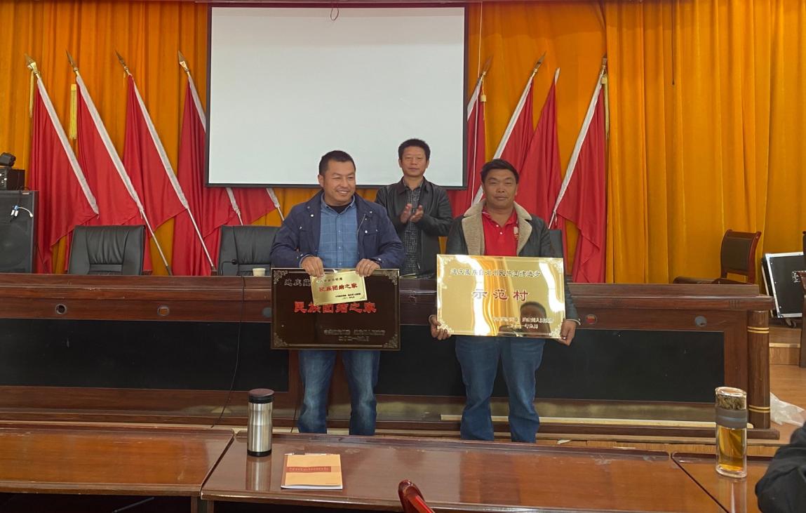 会议组织学习州委、县委第八次维稳工作会议精神,通报州委、州人民政府关于命名第二批民族团结进步示范单位和首批“民族团结之家”的决定,党委书记何振宇为获得称号的村、组、户进行授牌。