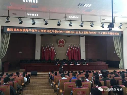 2018年4月24日,维西县第一期科级领导干部学习贯彻习近平新时代中国特色社会主义思想和党的十九大精神专题轮训班在行政中心开班,县委常委、组织部长赵雪峰同志作动员讲话,县委常委、县委办主任蒋智添同志主持会议。