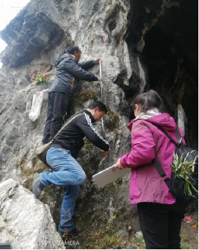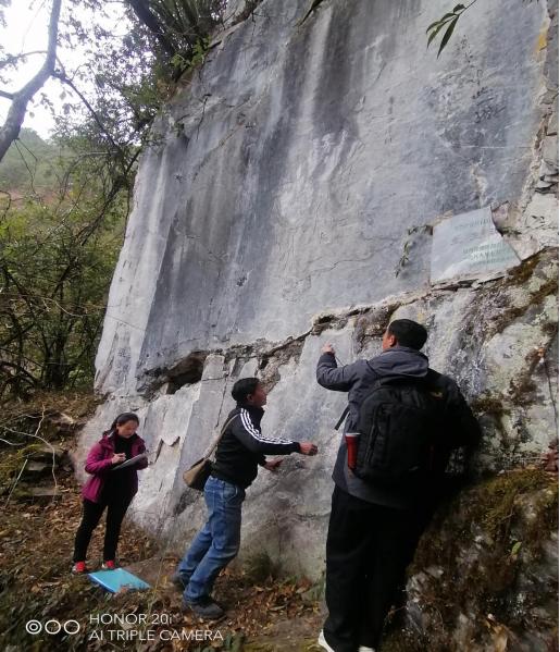在现场,工作人员对对生生洞摩崖石刻造像、洞窟进行测量、拍摄记录四围及顶部的图片,并对生生洞摩崖石刻造像横面及纵面等数据进行了测量、登记。核查了该文物保护单位的基础档案,通过详细的收集整理,初步采集了维西县生生洞及石刻的基本数据资料,为后续调查报告撰写、数据录入提供了有力的材料支撑。