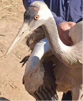 林场工作人员将受伤大鸟带回驻地并上报县林草局野生动植物保护办。经技术人员现场查看,受伤大鸟为一只成年灰鹤,属于国家Ⅱ级保护野生动物。疑似腿部受伤失去行动能力,需要进一步隔离观察。观察期间,工作人员给受伤灰鹤投喂了玉米、白菜等杂粮补充能量。