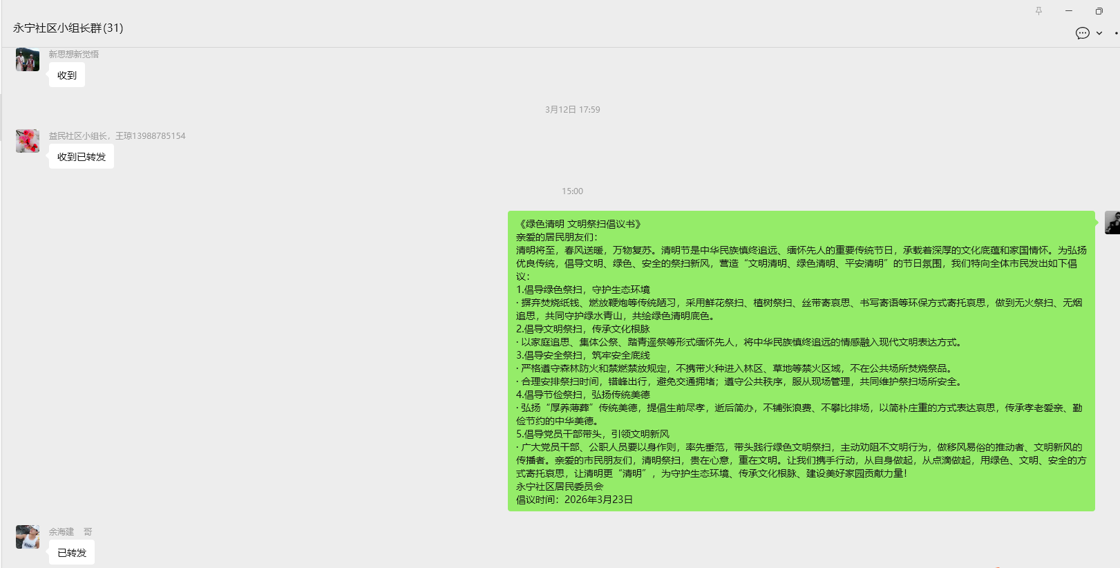 线上宣传扩覆盖:依托居民微信群推送倡议书、绿色祭扫知识及法律法规,实现宣传无死角。
