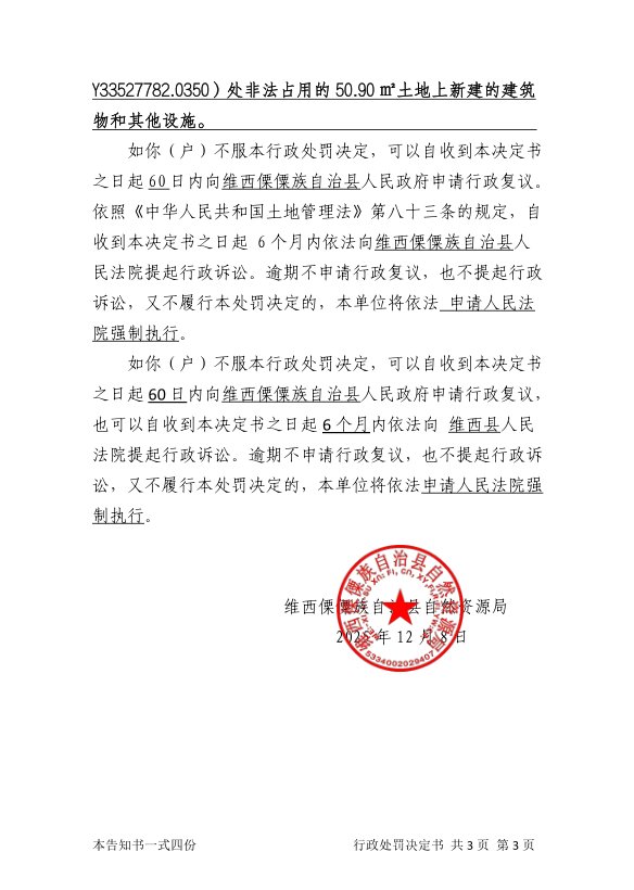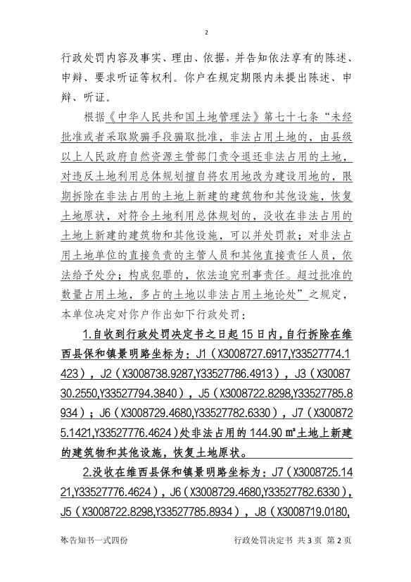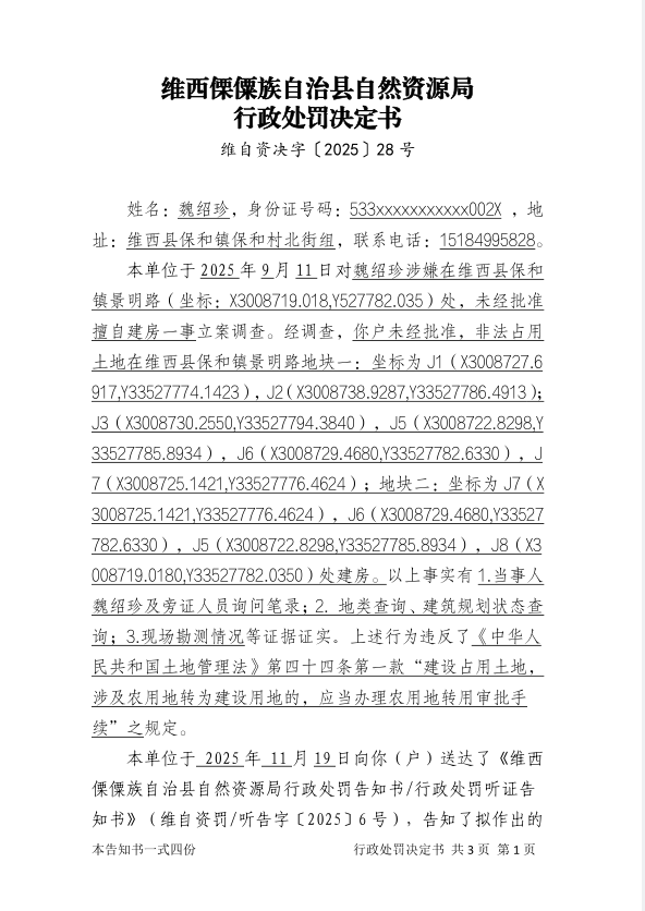 对魏绍珍户的行政处罚决定书