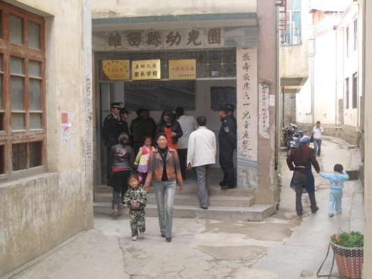 近期,保和派出所按照《维西县公安局集中整治学校及周边地区治安秩序专项行动工作方案》的要求,采取有效措施,迅速在保和镇幼儿园、中小学开展社会治安整治专项行动,加强矛盾纠纷排查和重点人员管控工作。深入查找学校及周边地区存在的突出问题和安全保卫工作中存在的薄弱环节。在对辖区学校进行检查过程中,发现以下学校存有一定隐患:1、保和镇完小上学、放学交通拥挤、堵塞,存在严重交通隐患。2、保和镇完小大小出入口有三个,没有专职保安人员,由学校教师每天4人轮流值周,出入口没有专人负责登记,上课时不关大小门。3、维西县一中、二中部分围墙没有加固、加高。
