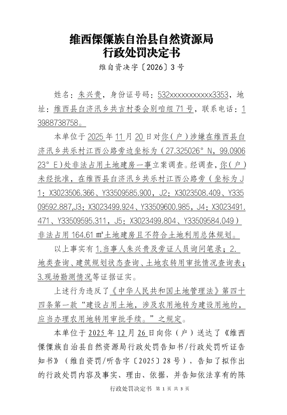 对朱兴贵户的行政处罚决定书