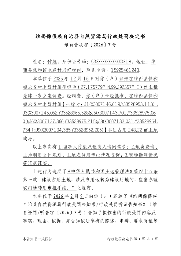 对付彪户的行政处罚决定书