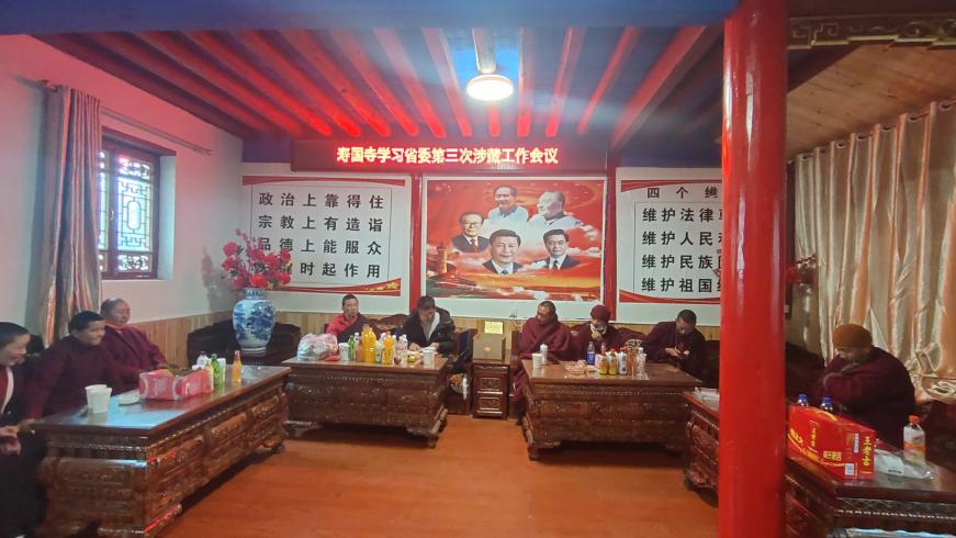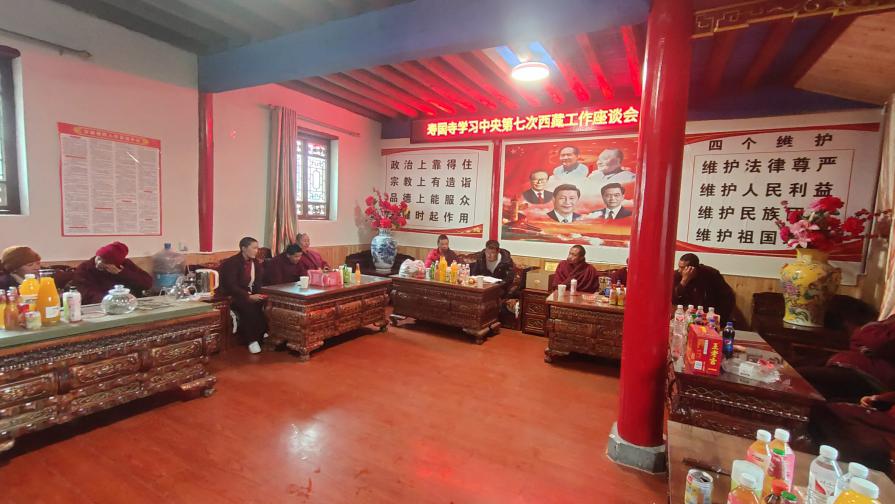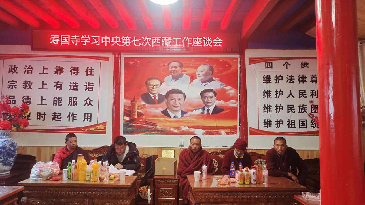 为全面贯彻落实习近平新时代中国特色社会主义思想,统筹做好三月维稳、经济社会发展和统战民宗领域各项重点工作,坚决维护全县政治安全和社会稳定,以优异的成绩迎接党的二十大胜利召开,2月21日上午,康普乡寺庙管理局组织寿国寺在寺僧尼开展了学习中央第七次西藏工作座谈会、云南省委第三次涉藏工作会议精神宣讲。