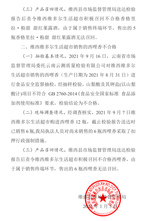 【食品药品安全信息公开】维西县市场监督管理局不合格食品核查处置情况 (2022年第1期)