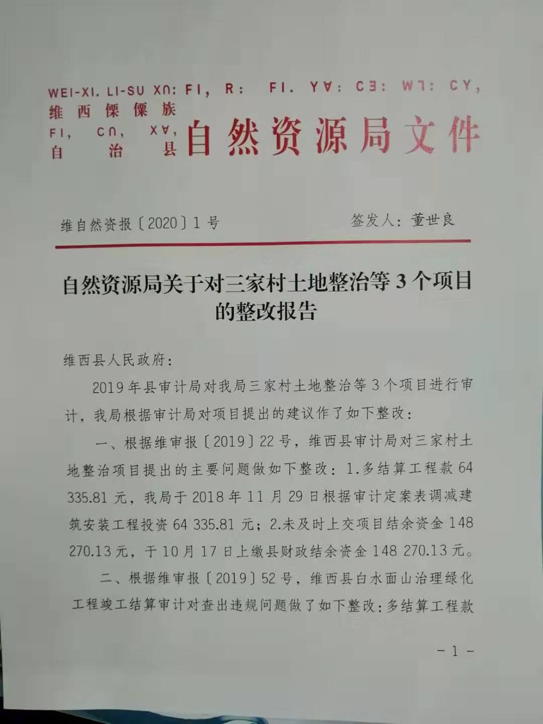 【信息公开】维西县自然资源局关于对三家村土地整治等3个项目的整改报告