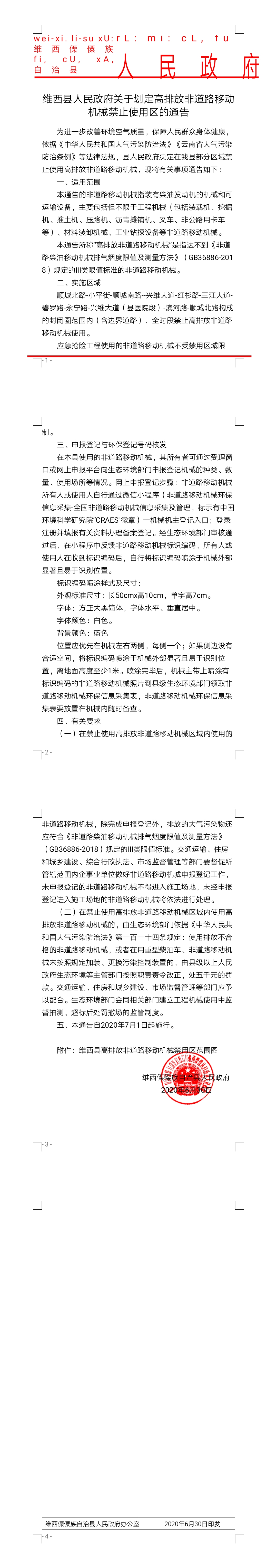 【信息公开】维西县人民政府关于划定高排放非道路移动机械禁止使用区的通告